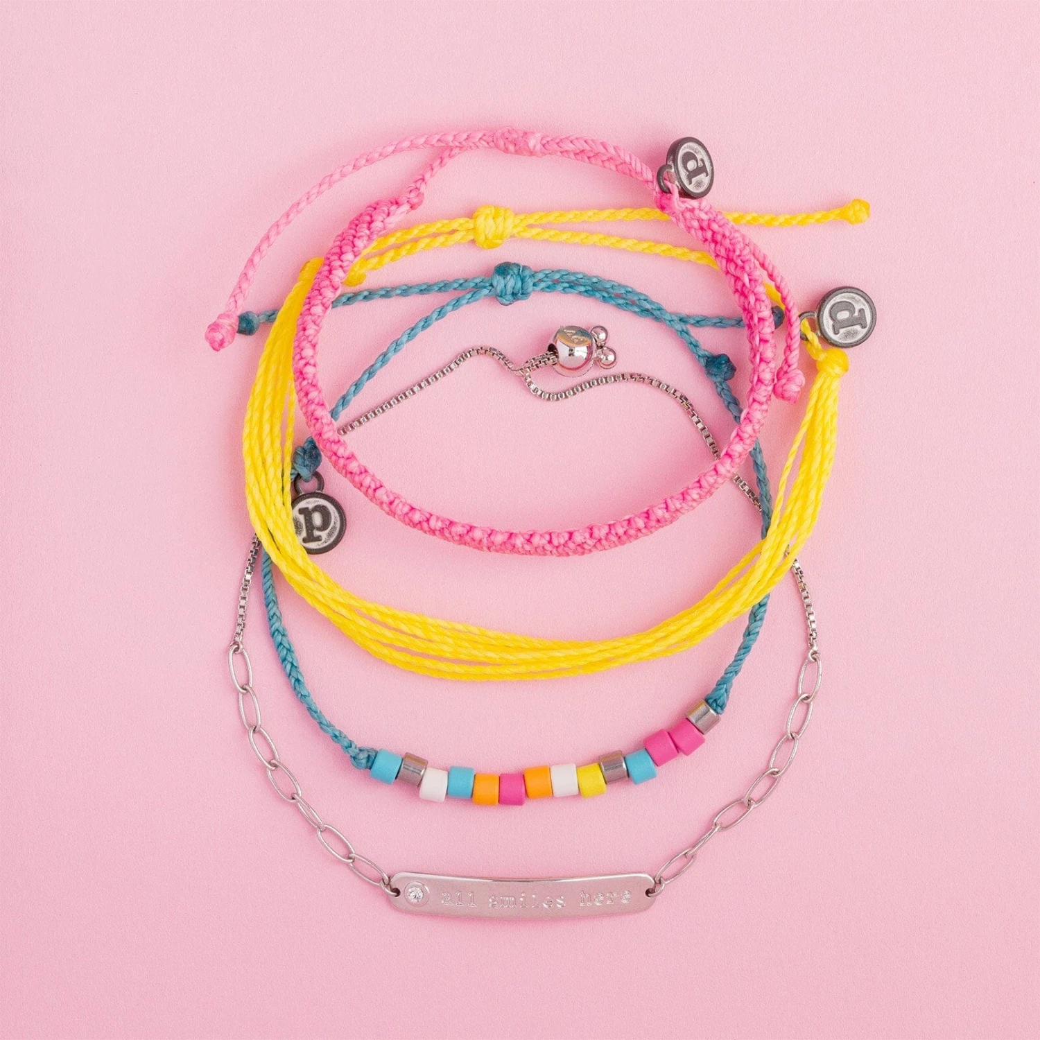 Two words: Charli. D’Amelio. Need we say more? If you’re obsessed with the TikTok star like we are, then you’re going to love this new influencer pack designed by the one and only, Charli D’Amelio!! It’s ALLLL smiles here with this bright and playful stack featuring 4 bracelets full of sunshine! This highly anticipated best-seller features bright shades of yellow, pink and blue, and includes a super cute beaded bracelet, a smile ready ID Bar Bracelet, an original yellow string bracelet, and a woven pink bracelet! This stack is sure to be your own personal pick-me-up!
