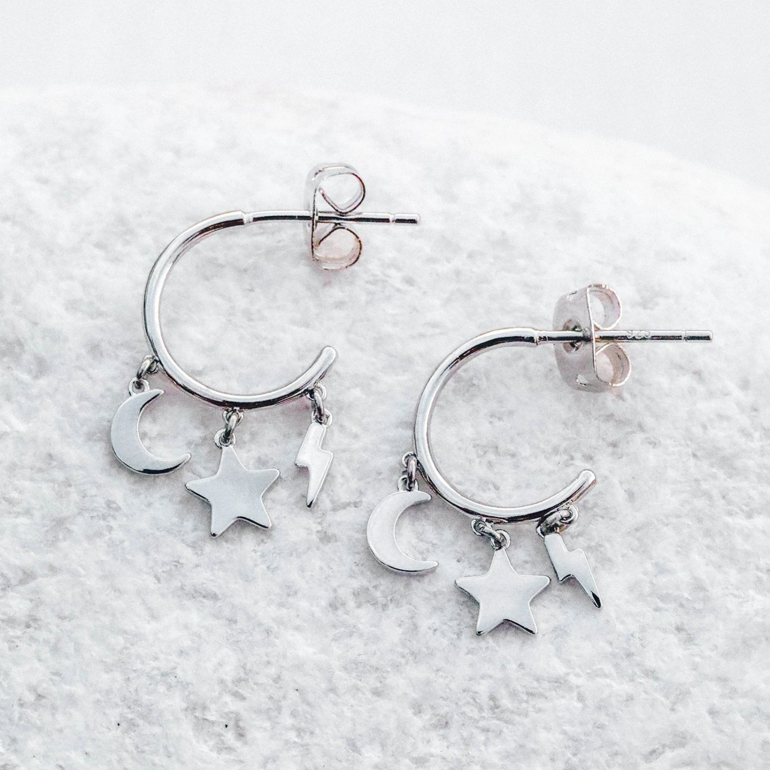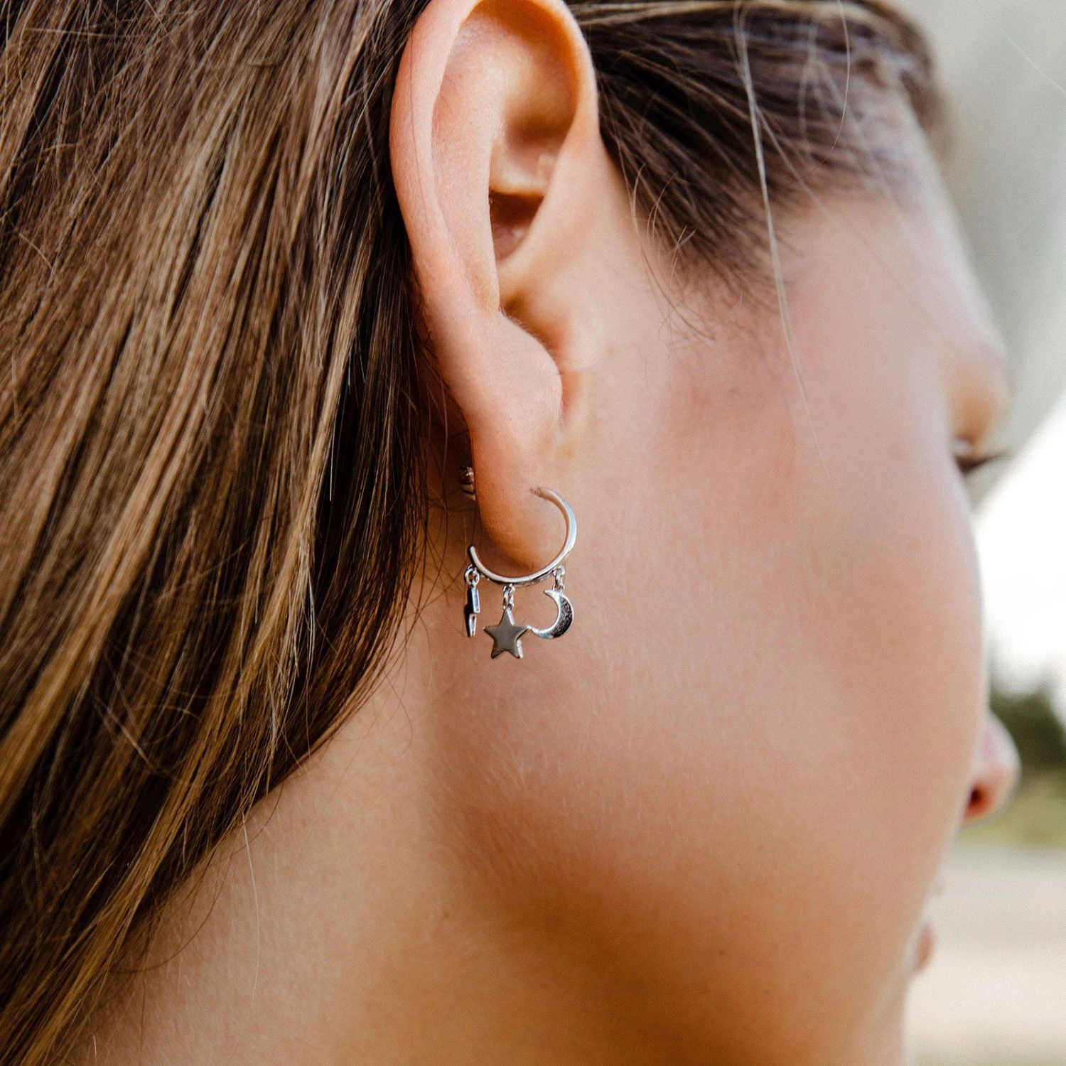 You should thank your lucky stars for our Celestial Charms Huggies. These suuuuper-stellar hoops come in a shimmering silver finish, with three dainty, dangling charms that sparkle and shine.
