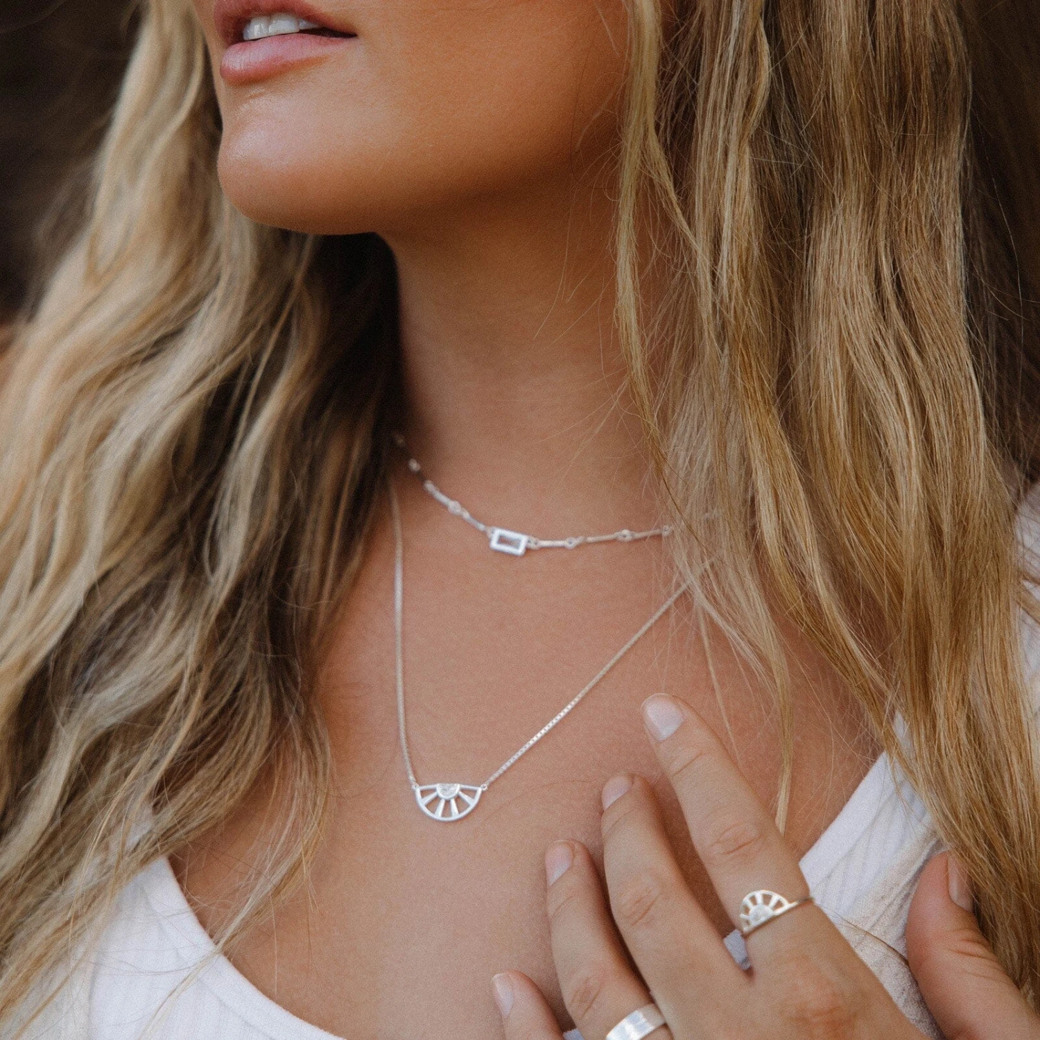 A beautiful reminder of the limitless potential of a new day, the Daybreak Ring is curved with detailed intention to mirror the natural shape of the finger you wear it on. The half-moon bezel set stone offers a subtle, eye-catching sparkle to reflect on throughout your day. Available in silver and gold.