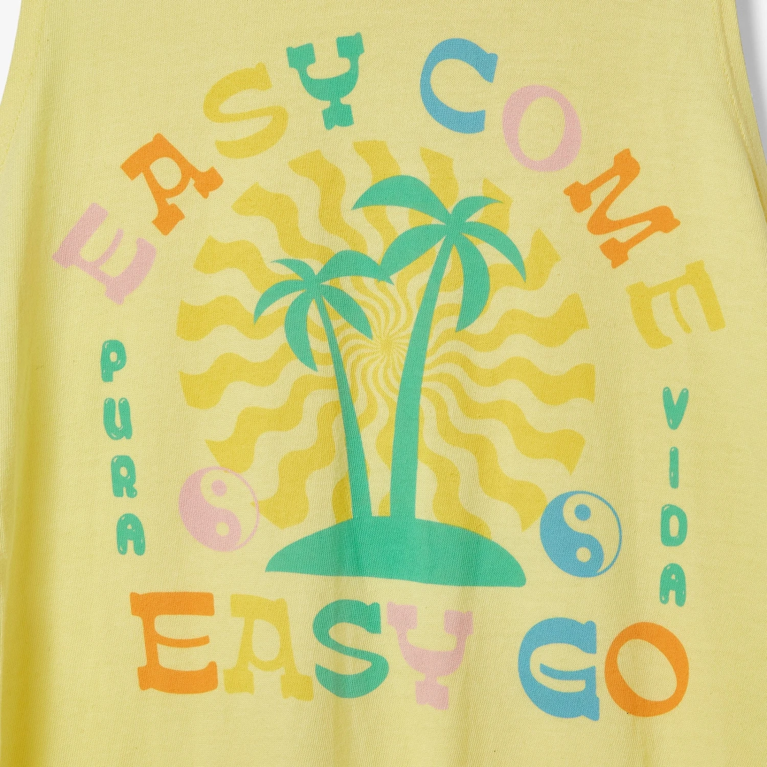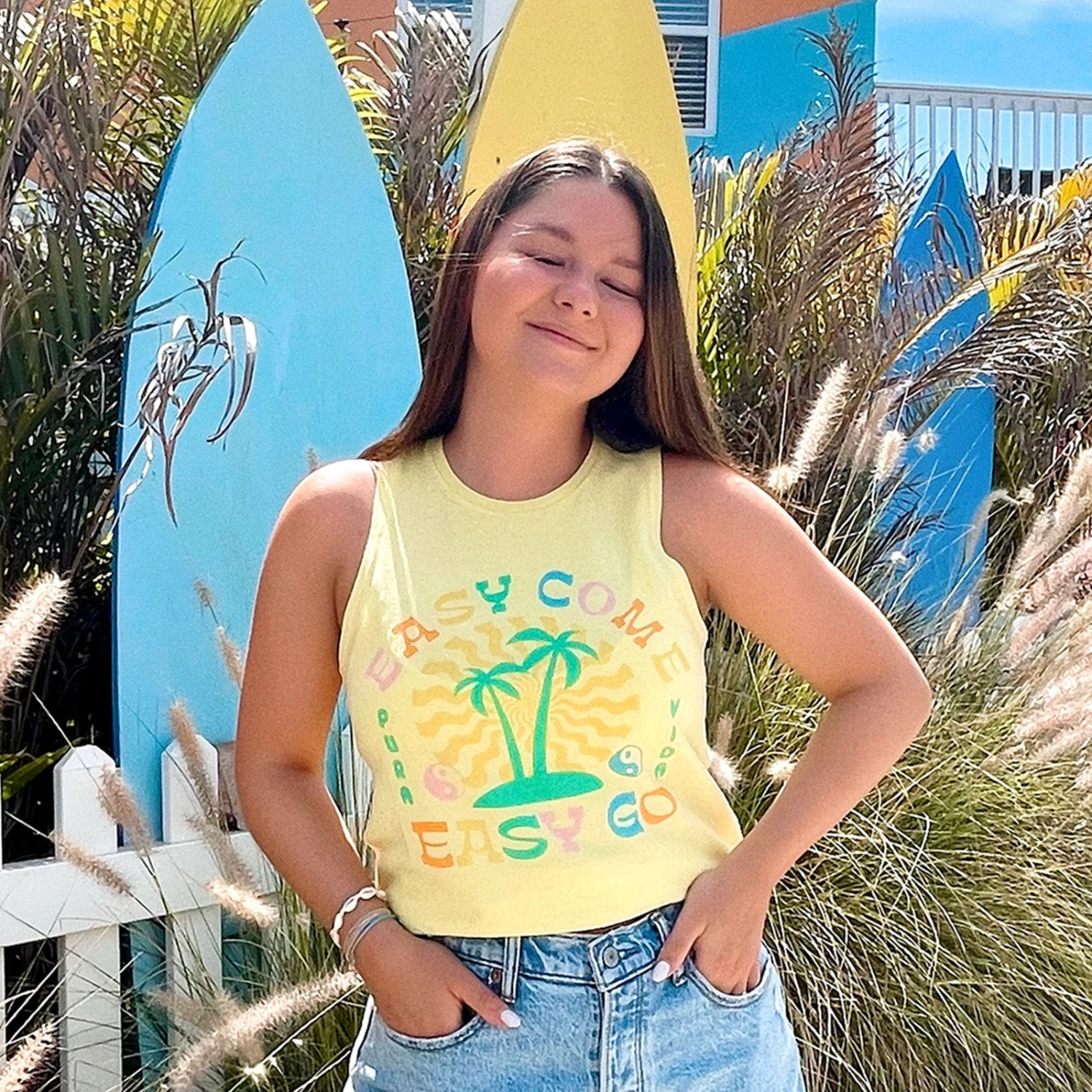 Look cool and stay chill in our Easy Come Easy Go Tank. This laidback design features a rainbow of pretty colors, with yin-yang and palm tree graphics and bold, retro lettering.