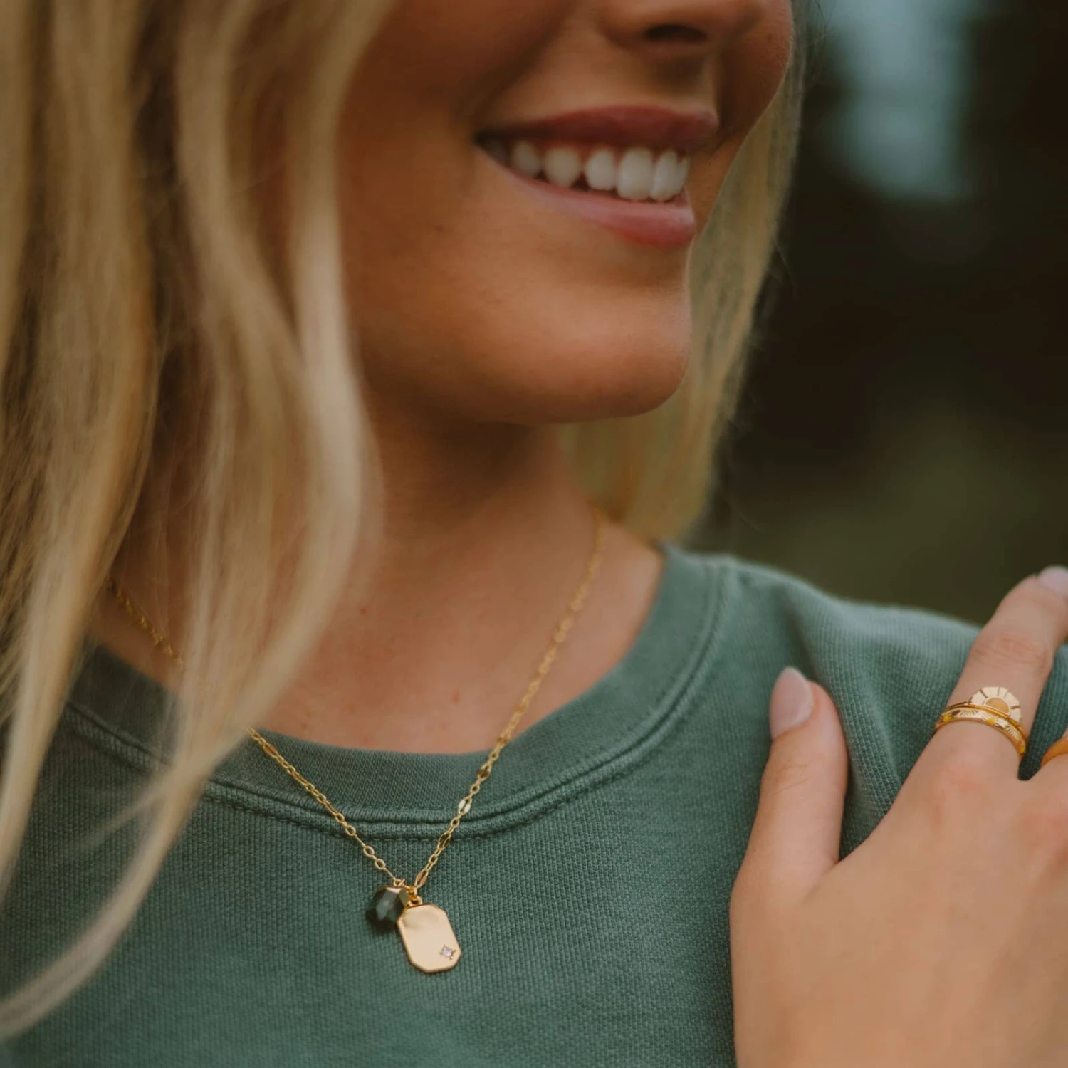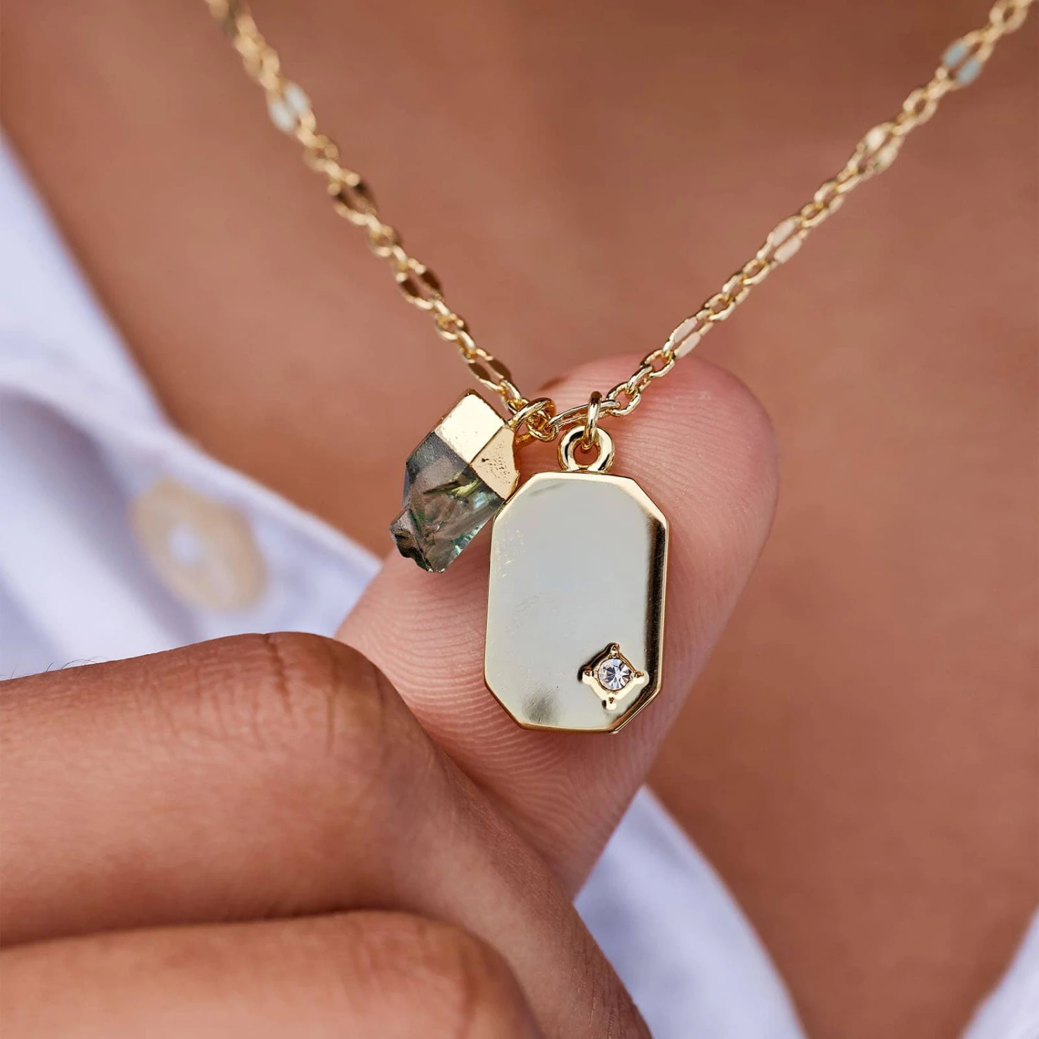 A serene jade center lives in harmony with the edged, bezel-set starburst detail of the gold-plated tag charm to create an adaptable base for your Cali-cool jewelry canvas.