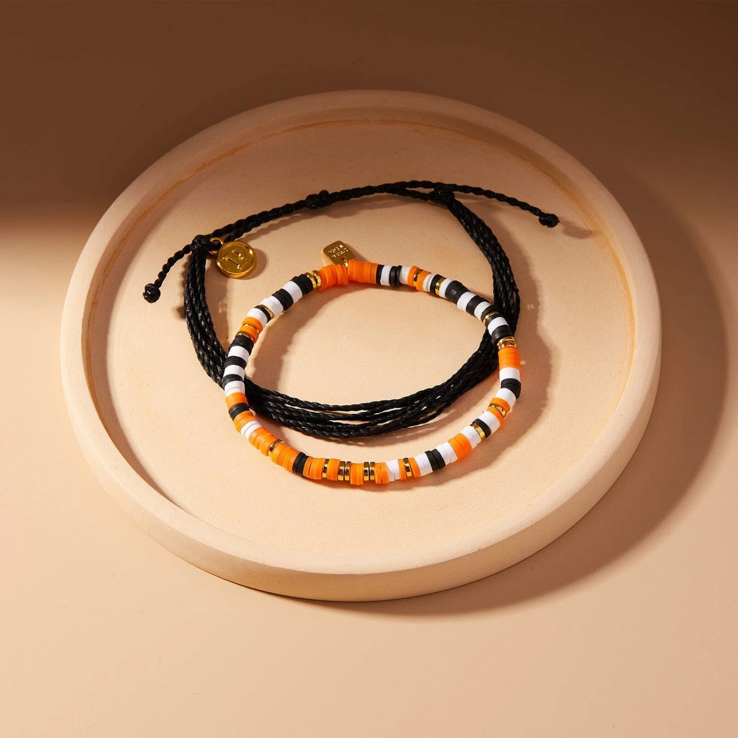 Give them pumpkin to talk about with this dynamic bracelet duo. The seasonal colorway of the Heishi discs sits around a durable, stretchy elastic cord and pairs with a classic, nine-string bracelet to create a spooky centerpiece for your bracelet stack.