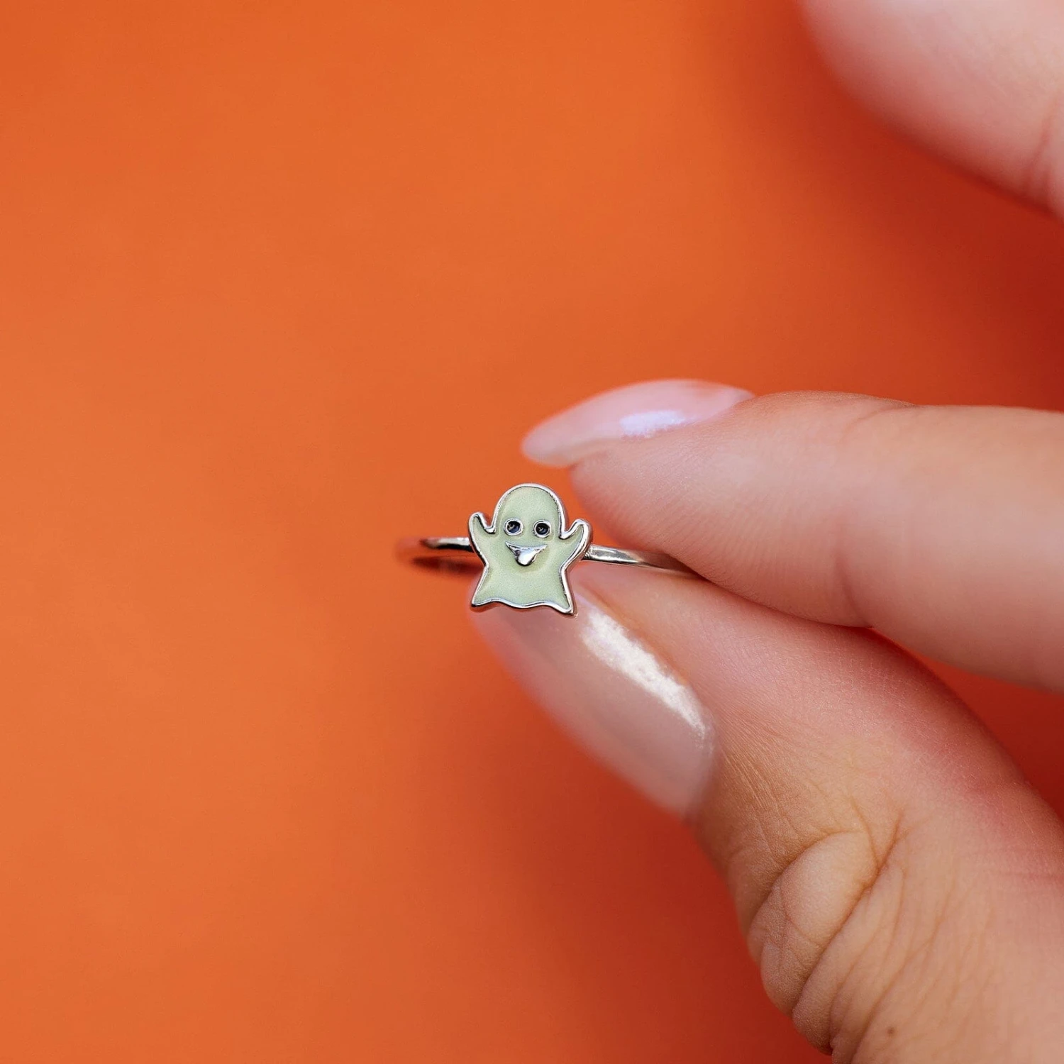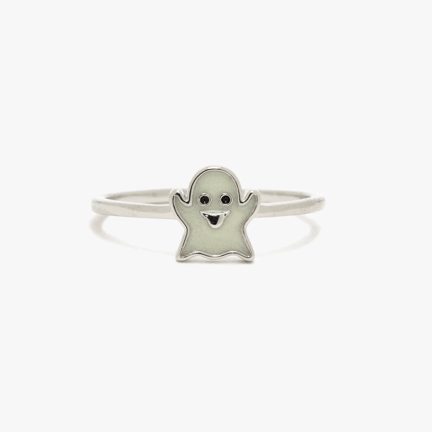 Spooky season ghouls. The Glow in the Dark Ghost Emoji Ring is hard to miss with a continuous, Rhodium-plated casting featuring a luminescent friendly face. Available in sizes 4-10.