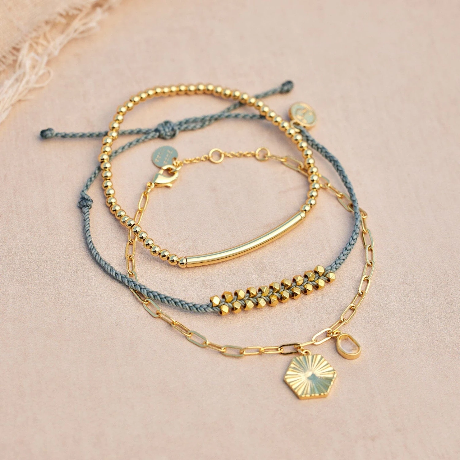 Our Good Fortune Style Pack gives off the *best* vibes. This trio of stunning styles includes a gold beaded beauty with bar tube detailing; a bitty braid design with faceted gold seed beads; and an open-link bracelet with an etched charm and natural quartz stone.