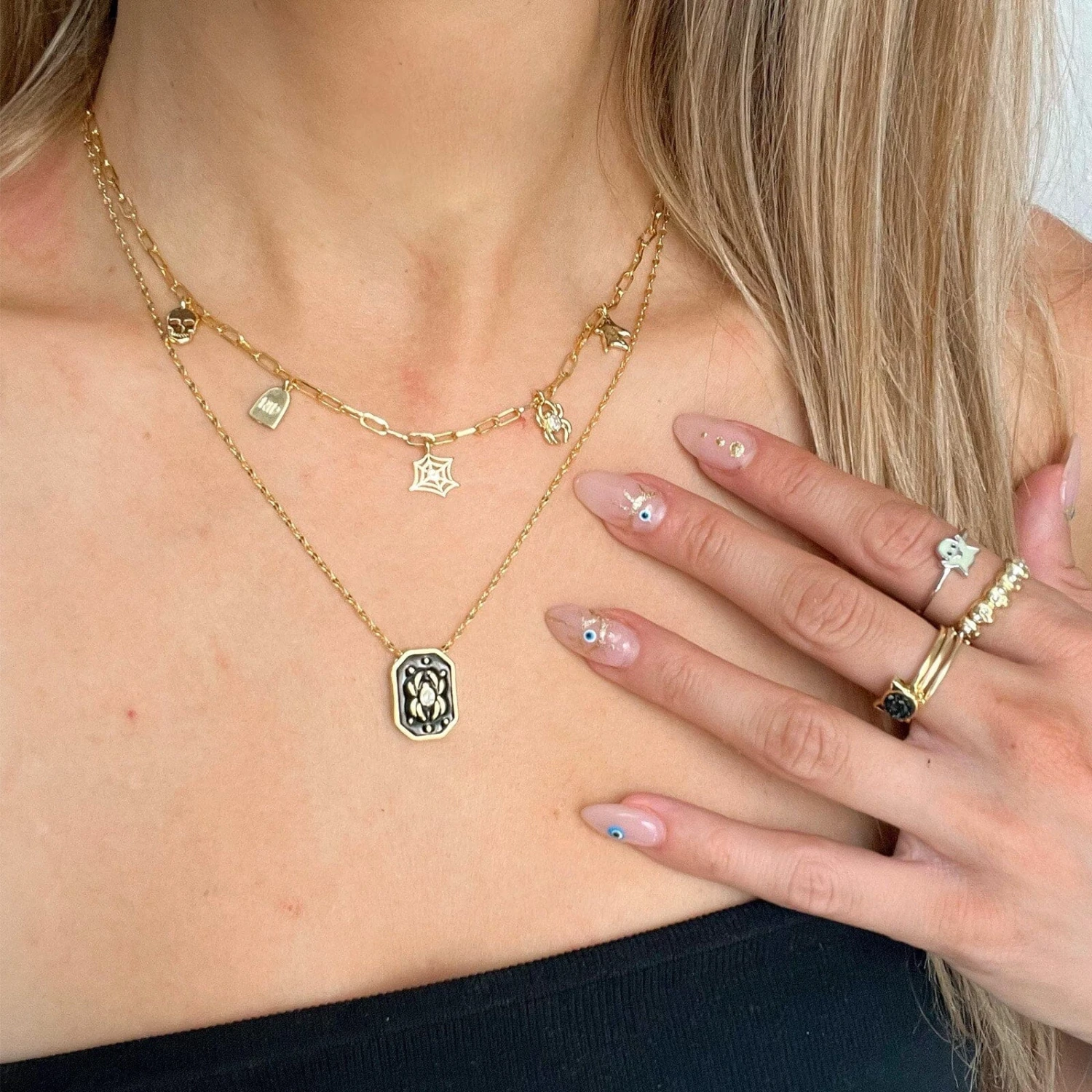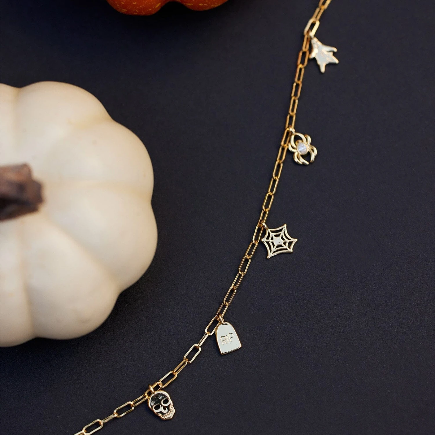 The cornerstones of spooky season woven through a dainty, paper clip chain. This charming, gold-plated charm choker is the perfect subtle seasonal nod to incorporate into your everyday jewels.