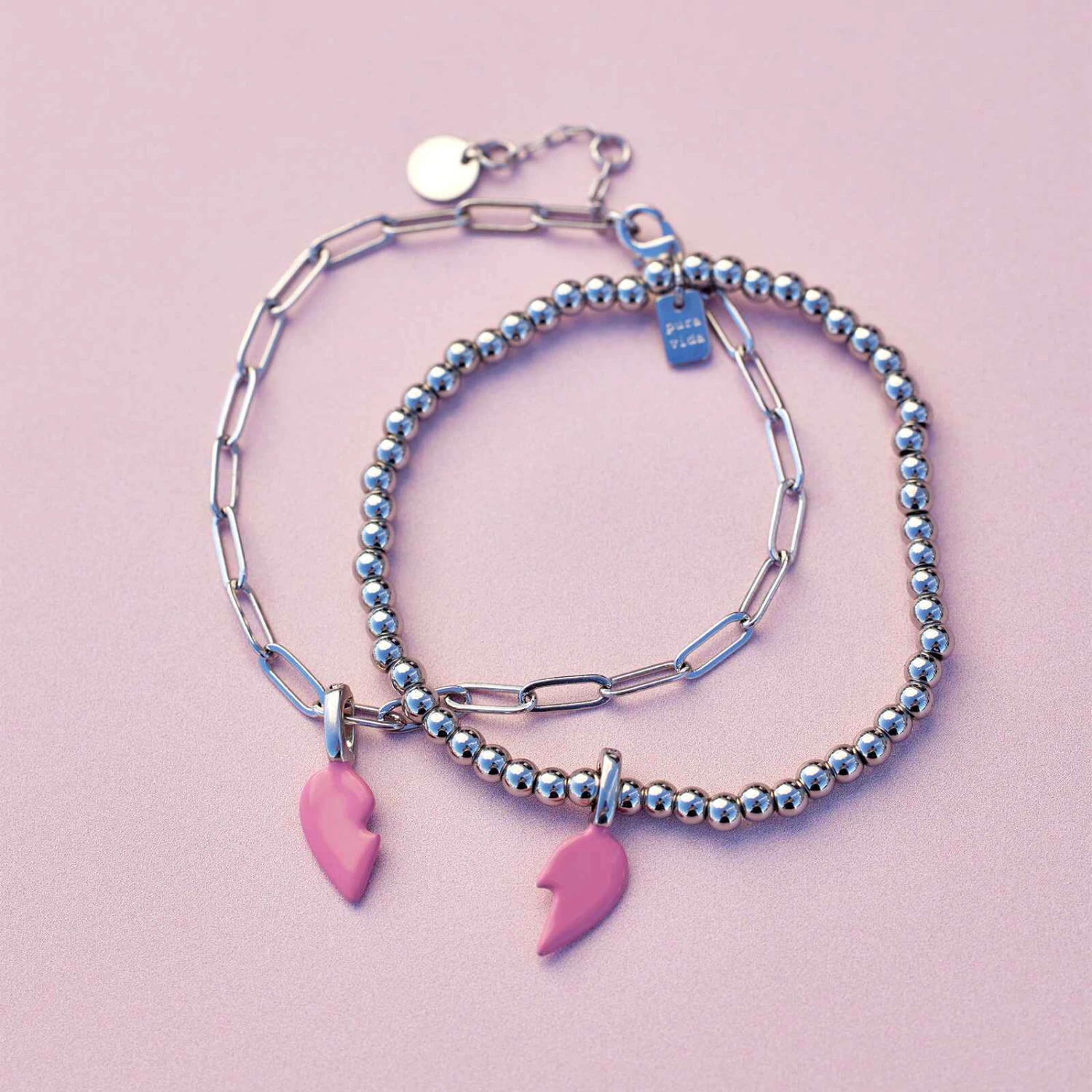 Two halves of the same, inseparable whole. These rhodium or gold-plated charms feature Valentine’s-inspired, glossy enamel halved hearts that fit together seemlessly to recreate classic BFF bracelets, with a modern twist.