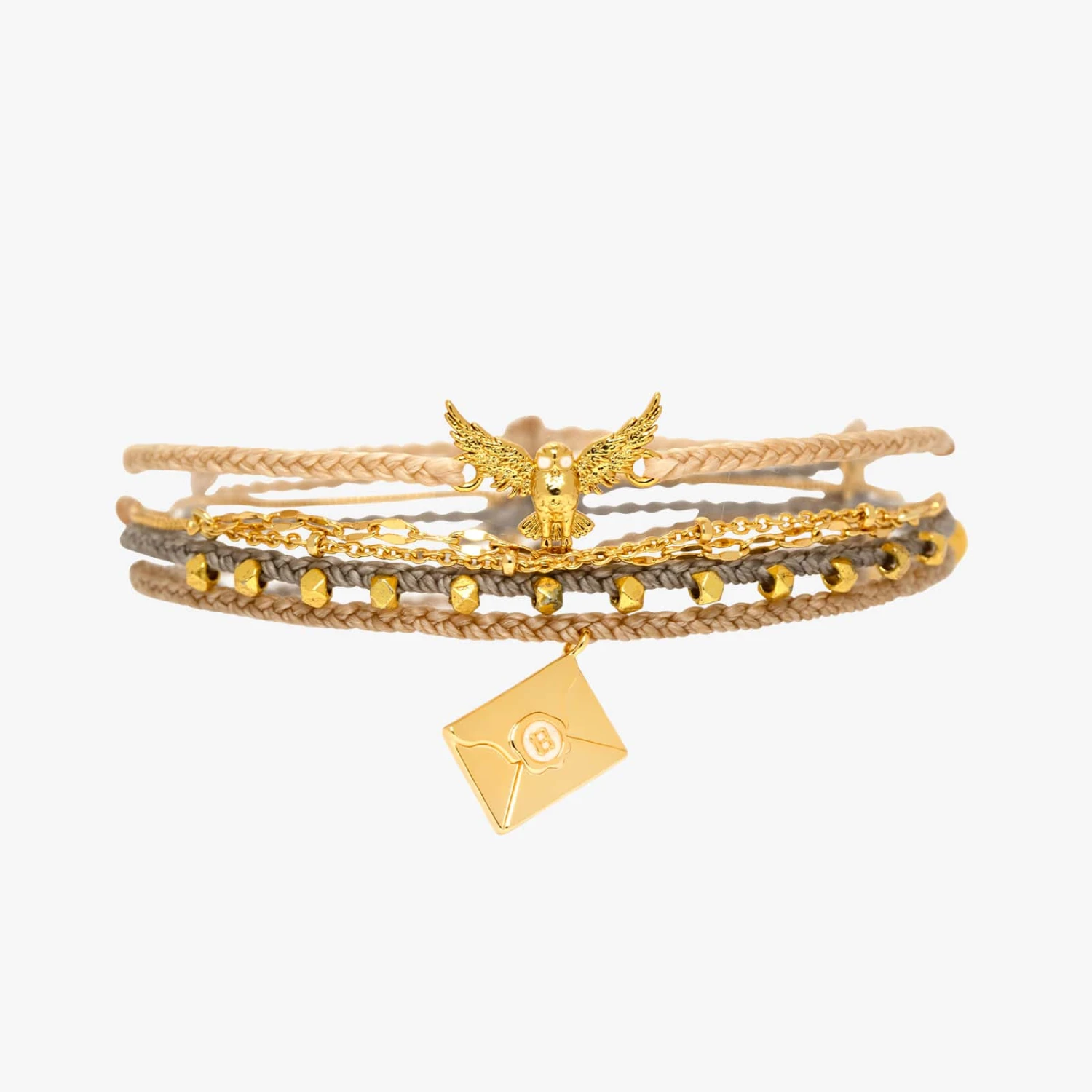 The second-best thing to getting accepted at a school of magic? Our Hogwarts Letter Style Pack! This four-piece stack includes a gold-studded Malibu bracelet, a golden layered slider style, a Hedwig charm design, and a bitty braid bracelet with your very own Hogwarts letter charm. For every style pack sold, Pura Vida will donate 5% of the purchase price to the World Literacy Foundation, with a maximum donation of $25,000. Your donations will help further the World Literacy Foundation’s mission to ensure that every child—regardless of geographic location—has the opportunity to acquire literacy skills and books to reach their full potential!