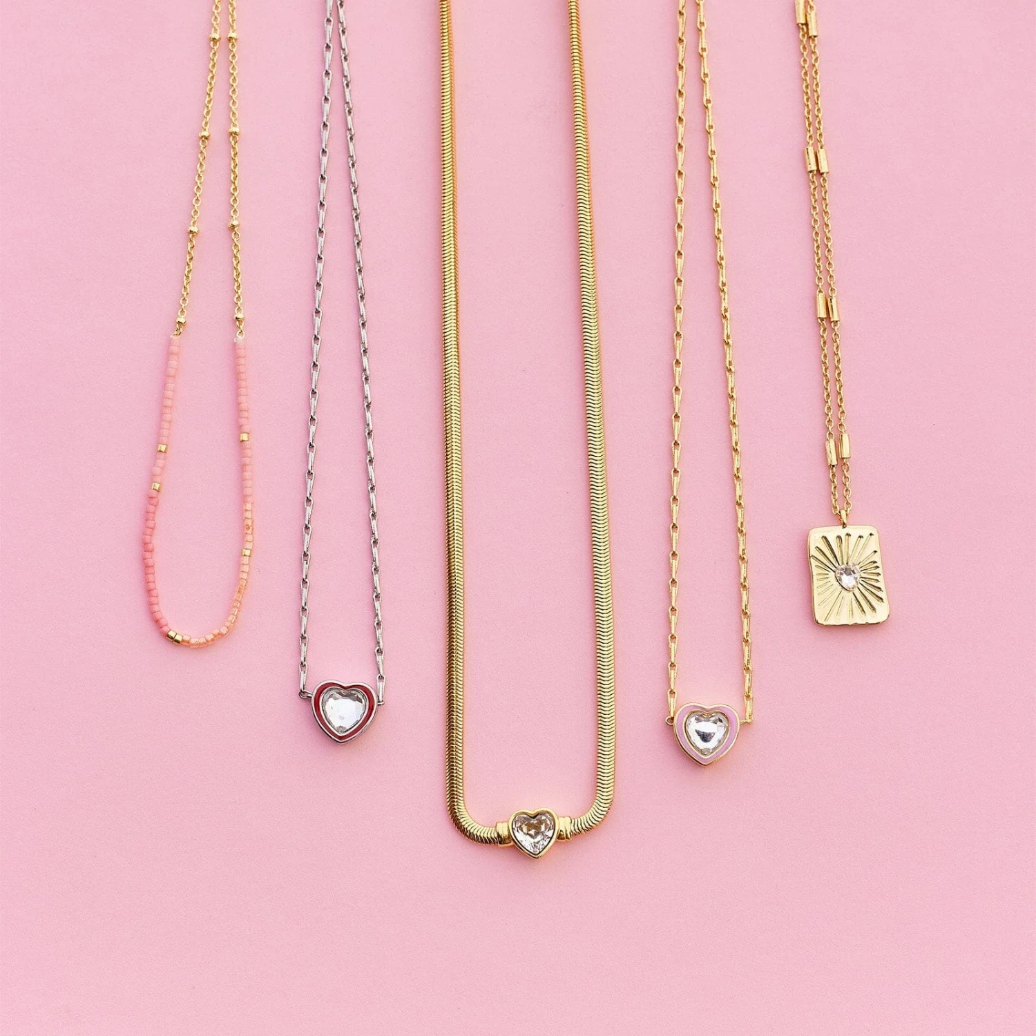 Keep your heart front and center this Valentine’s Day with the Heart Burst Pendant Necklace. Destined for stardom within your necklace stack, this statement piece joins the romance of a bezel-set glass center stone with the dimension of a bar chain base to create a pendant you’re sure to reach for time and time again.