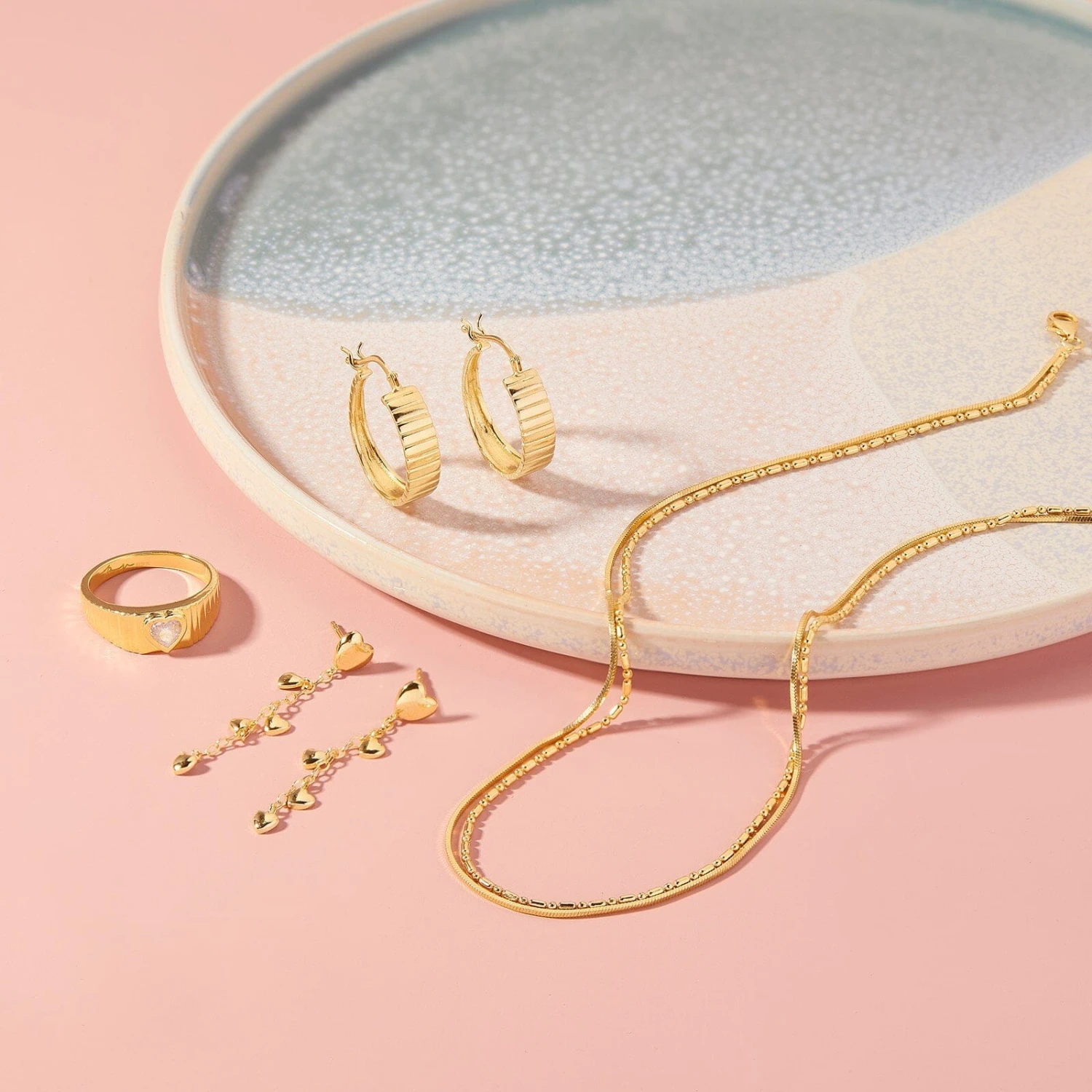 A cascading chain of romance arriving just in time for Valentine’s Day. It all starts with a gold-plated, heart-shaped stud base that leads to a flat cable chain stitching together the remaining four heart charms. Complete with a smooth, polished finish.