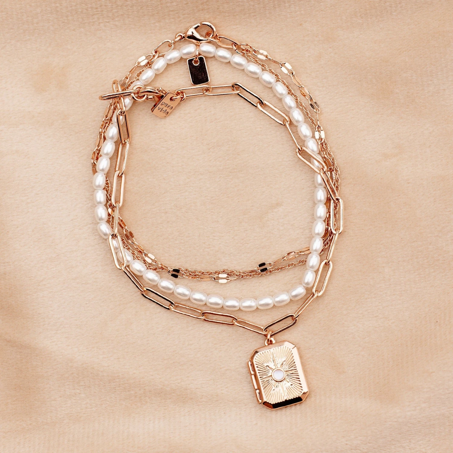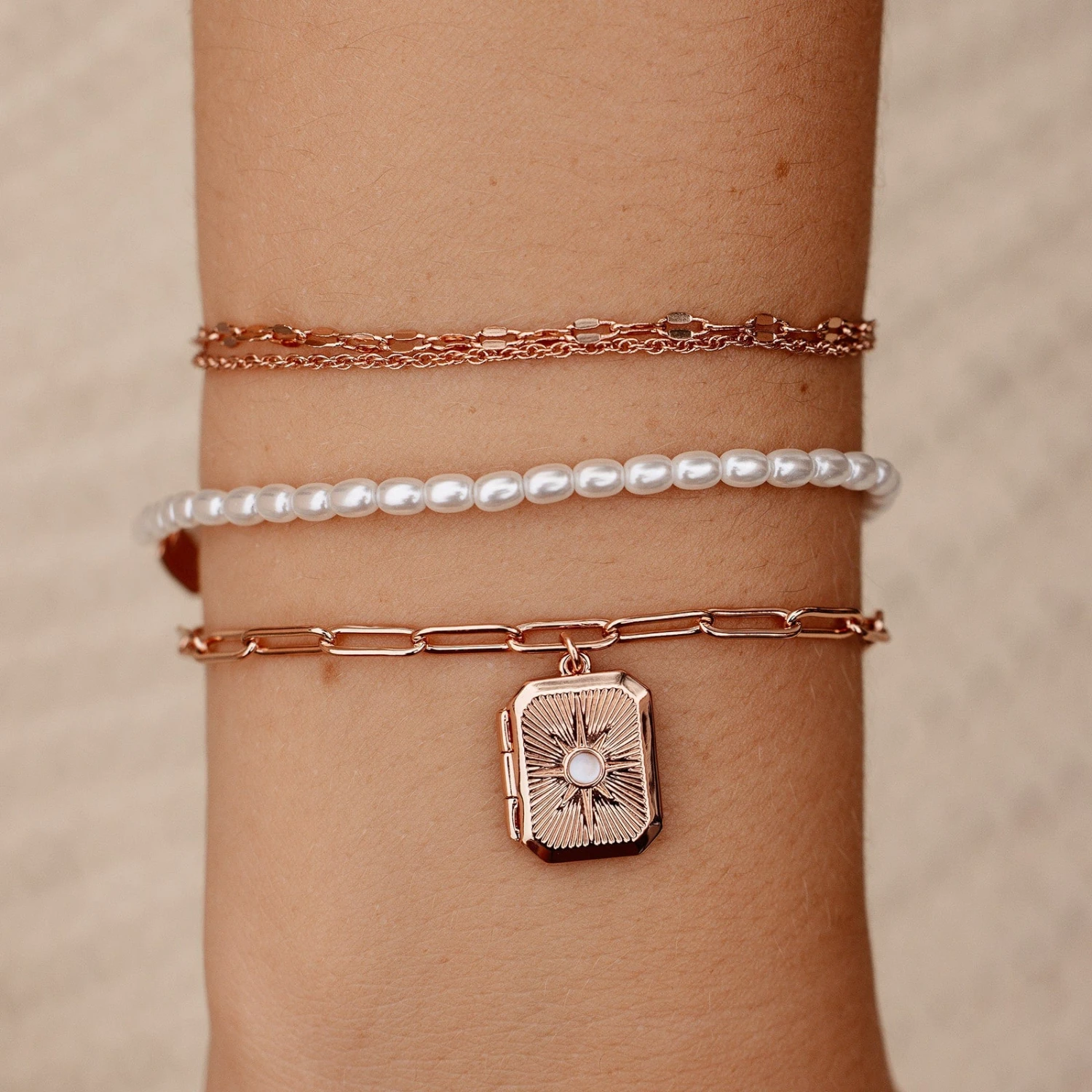 Add a little shine to any look with this trio of bracelets! The Heirloom Style Pack features 3 separate bracelets: a paperclip chain featuring a moonstone locket, a glass pearl bracelet, and a double-chain bracelet featuring a simple rope chain and a flat mirror chain.