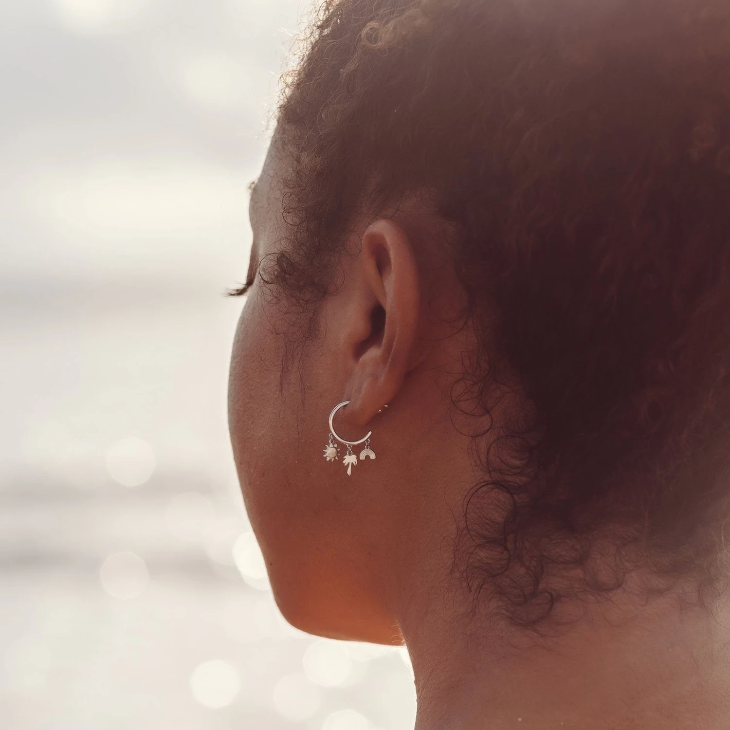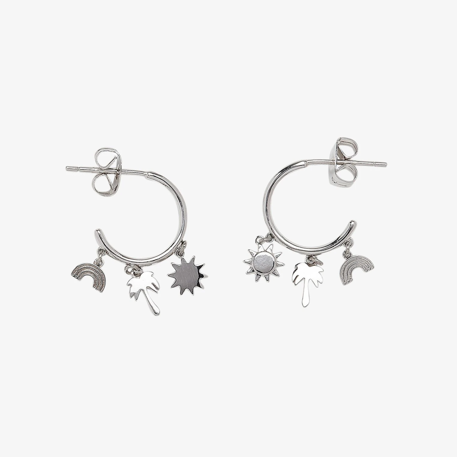 Rep your own piece of paradise with our Maui Charms Huggies. These silver hoops feature a trio of dangling sun, palm tree and rainbow charms. Match it back to our Maui Charms Bracelet and Anklet to make every day feel like vacay.