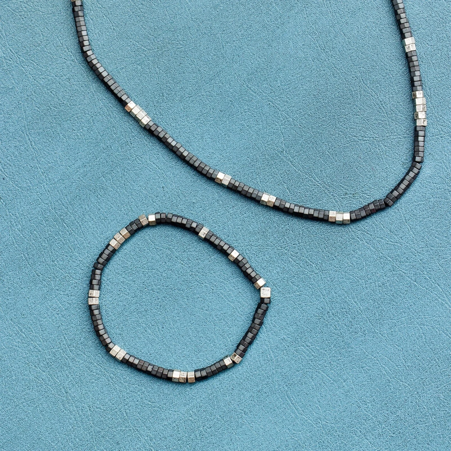 Mixed metal melody of rondelle beads set between rugged, faceted pyrite. Also available in a necklace.