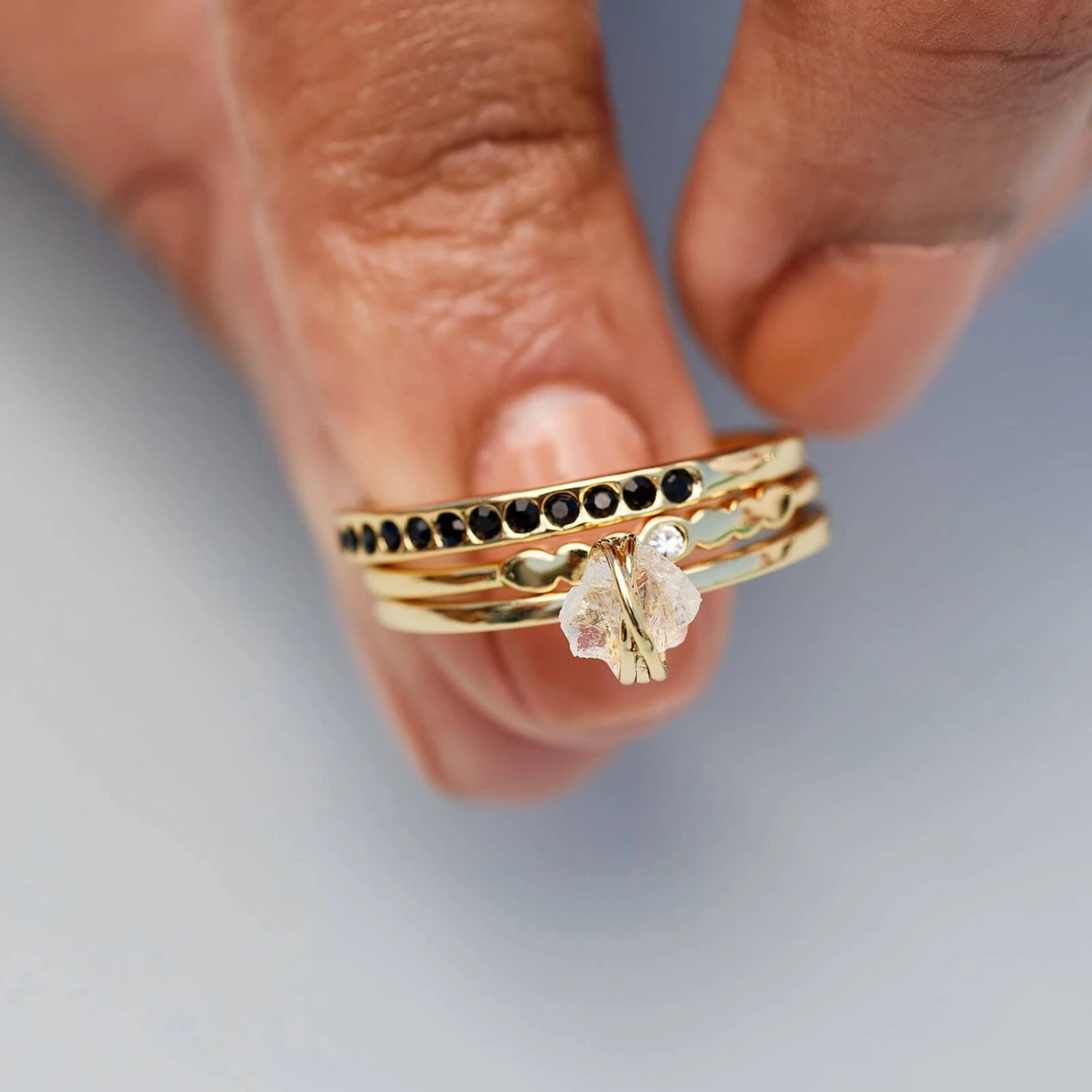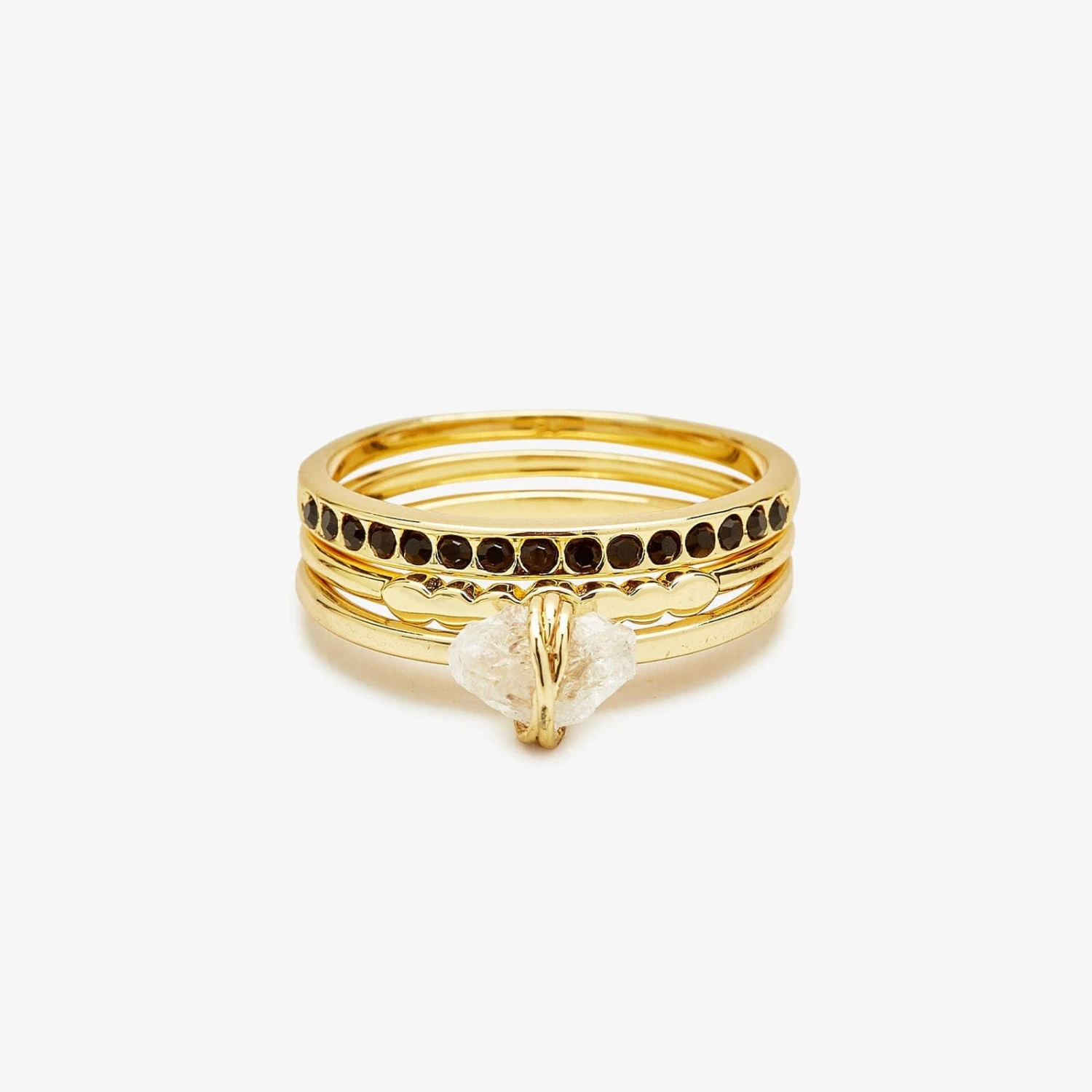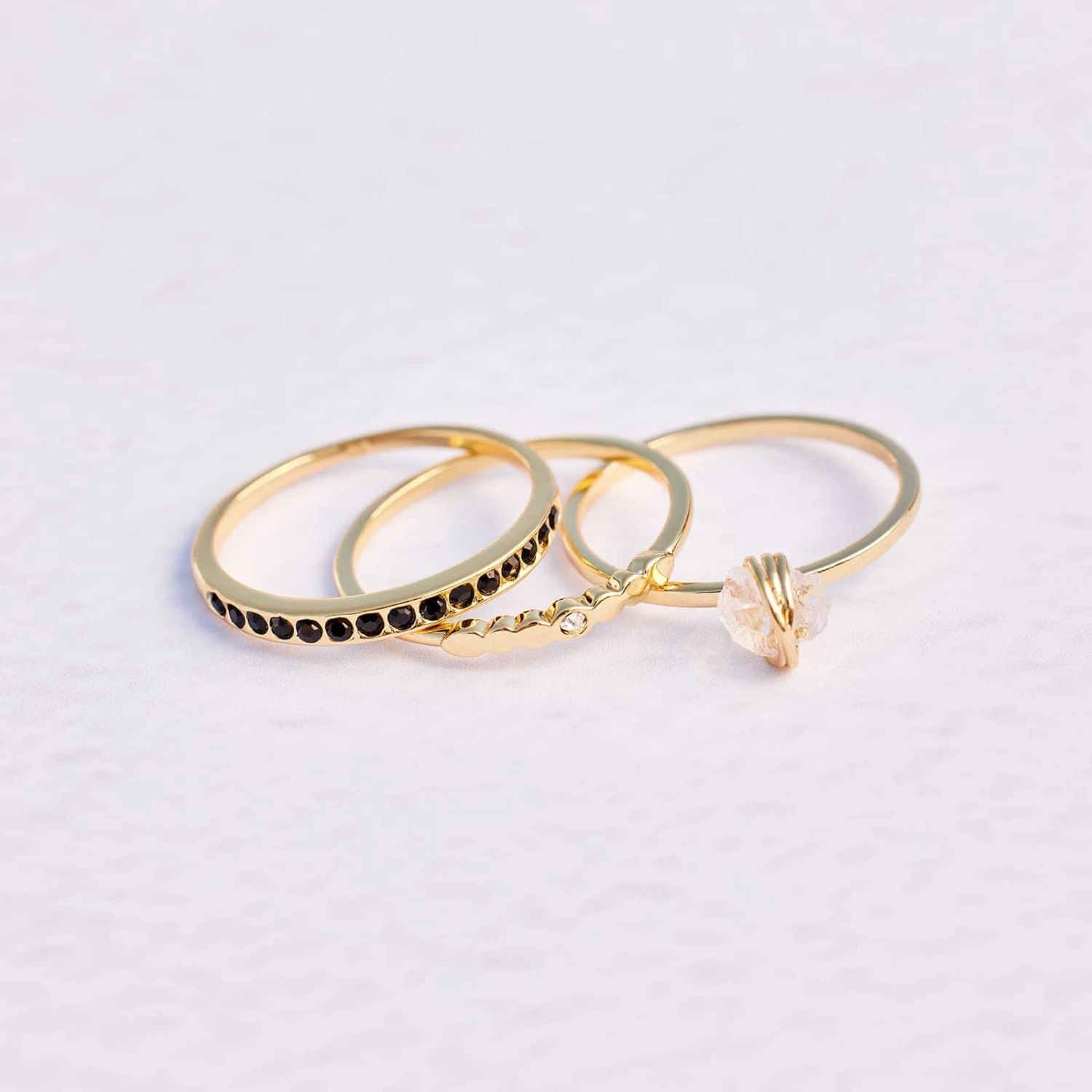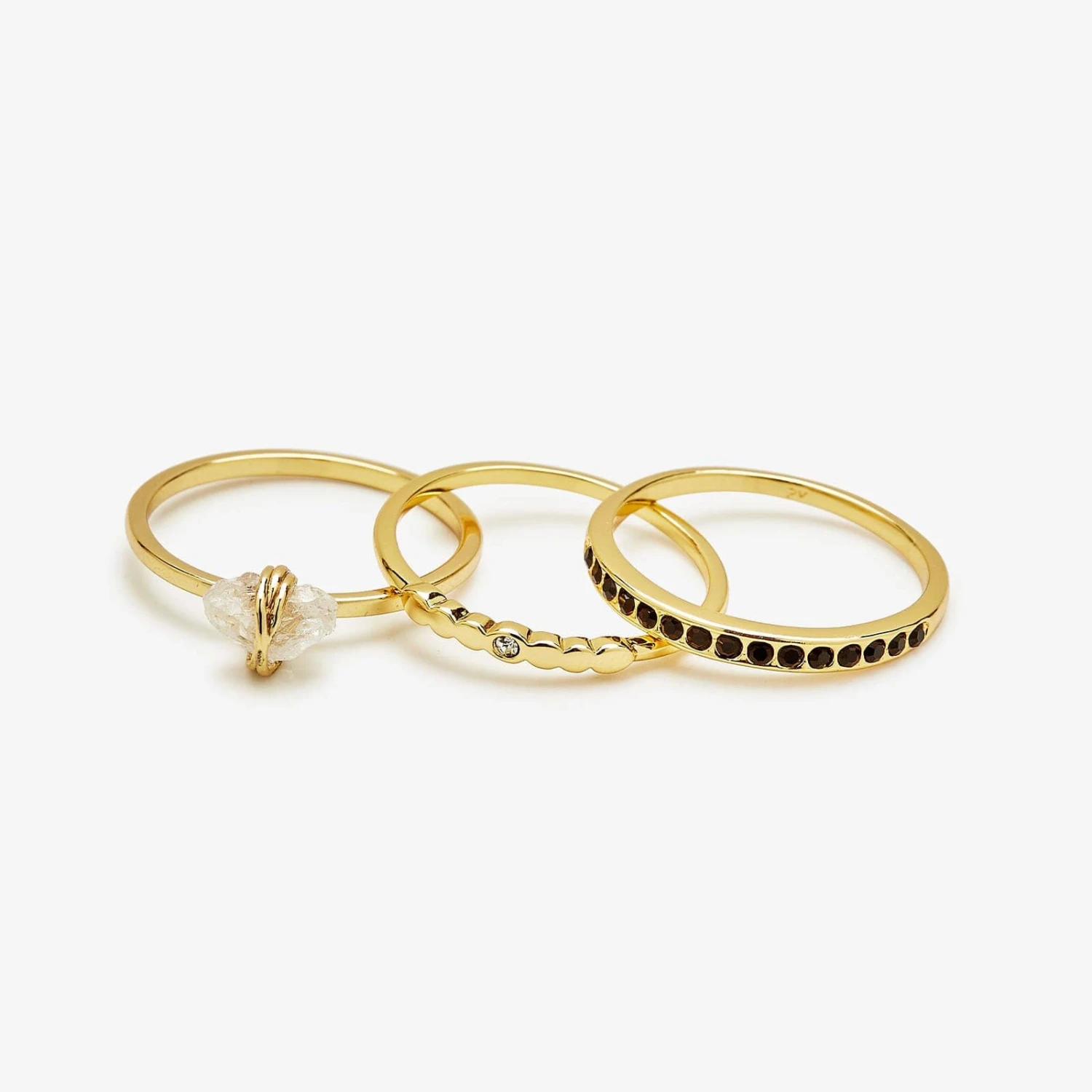Each tier of this on-trend trio offers unique elements that can be mixed and matched into any stack. The top ring features a row of bezel-set clear black glass stones while the second and third feature compelling center stones wrapped in wispy, gold-plated bands.