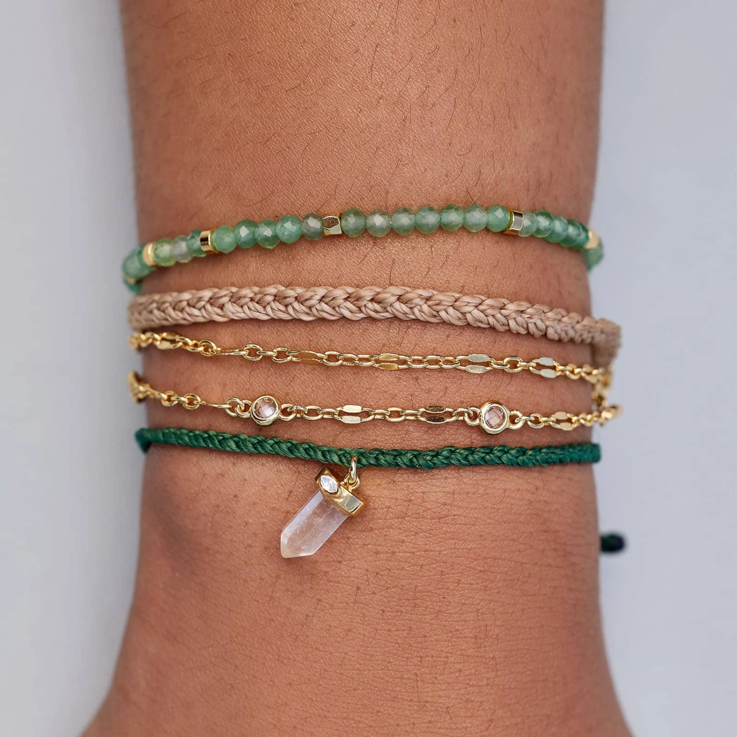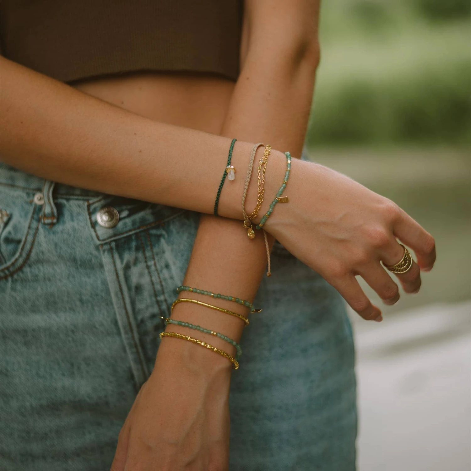 A trio that tests different tones and textures to achieve a fall classic you’ll reach for all season. The mixing of metals and materials, like emerald beading and fancy chain trim, allows you to unite multiple style directions into a single stack.