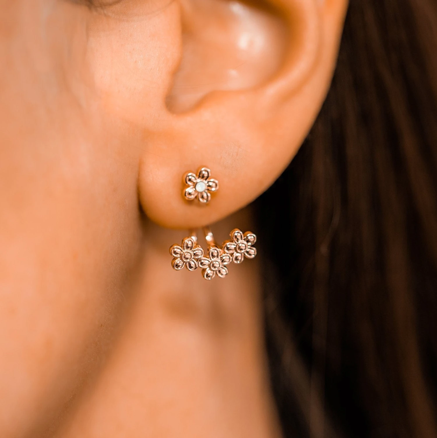 Stop and smell the flowers in our Opal Daisy Ear Jackets! Painted in a pretty rose gold, each earring features three floating daisies and a daisy stud with a pop of opal.