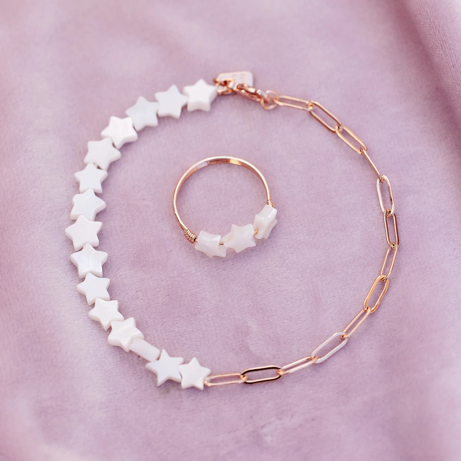 It’s a star-studded affair! Take your ring game to the next level with this dainty Pearlized 3 Star Ring in Rose Gold! Perfect by itself or added to a stack, this chic ring is made up of 3 pearlized star beads resting on a triple band plated in rose gold.