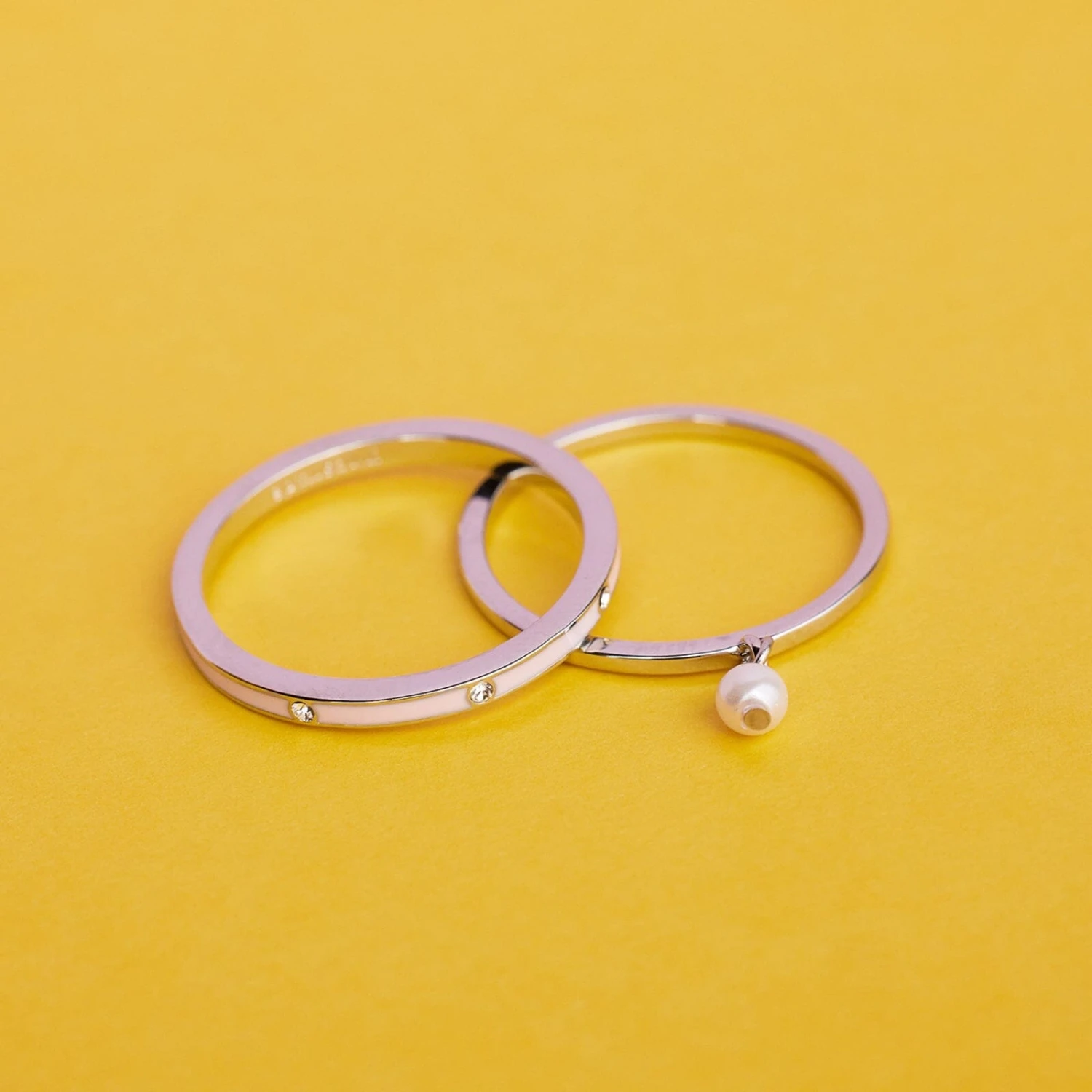 Our Pretty Things Ring Set is total girly goals. Featuring a baby pink enamel band with three sparkling crystal stones, this duo also features a delicate silver style with a dainty, dangling pearl charm. Wear ‘em both together for the ultimate ladylike look.