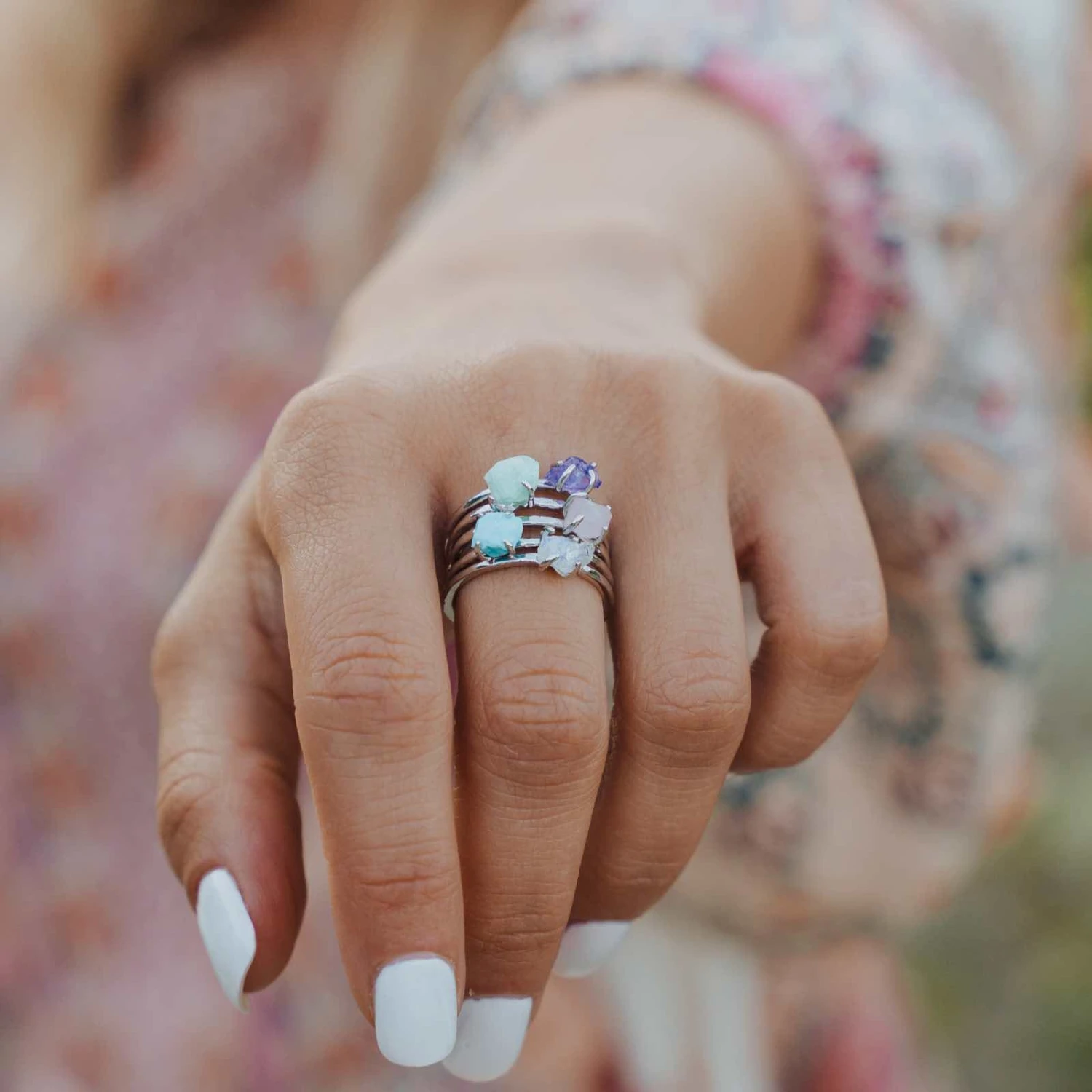 Bring the good vibes wherever you go with this simple yet chic Raw Gemstone Ring! This sleek silver look comes in five gorgeous gemstones – amazonite, amethyst, moonstone, rose quartz and turquoise – that each exude a different vibe. And because each stone is 100% unique, no two look alike!
