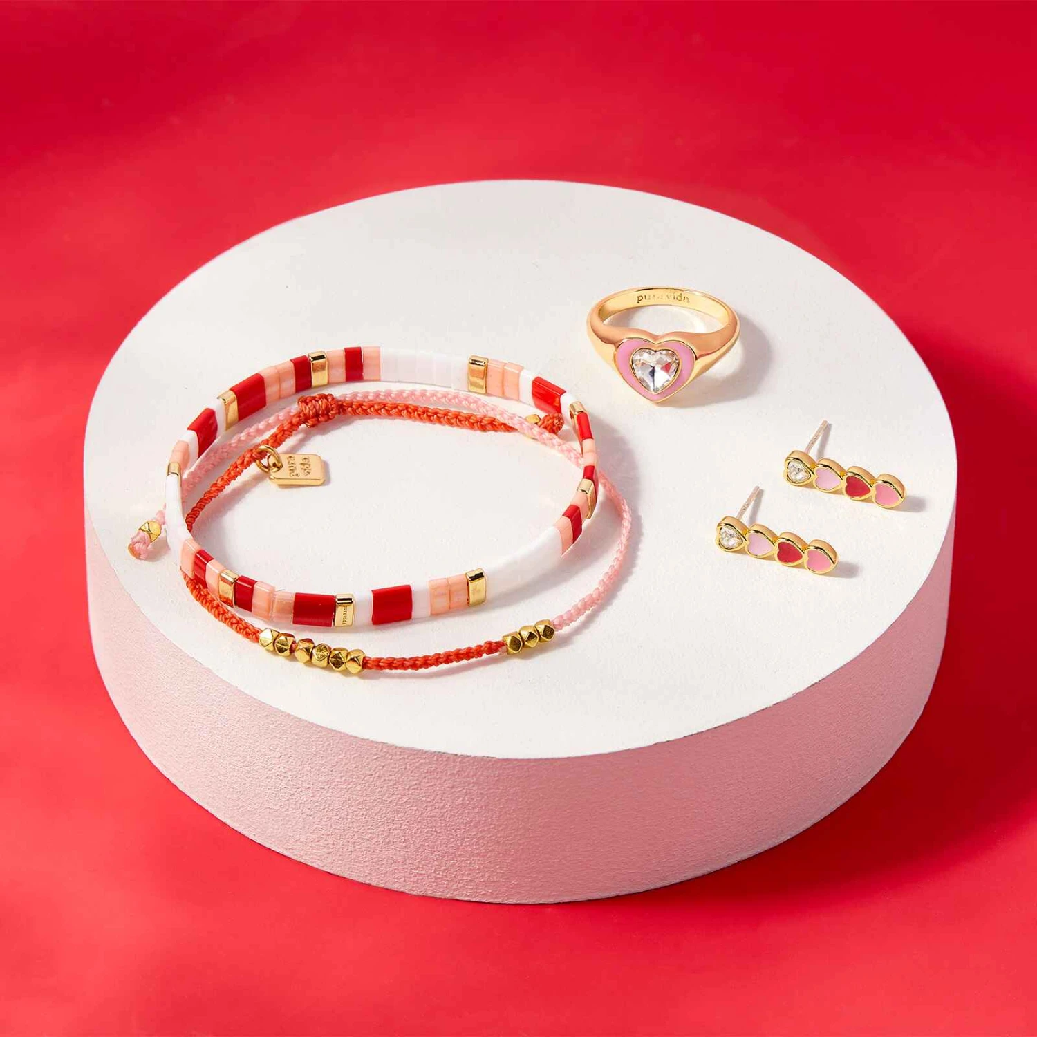 The category is: sweet, stacked, and sassy. The Smitten Enamel Heart Drop Earrings create a multi-tone cascade stemmed from an eye-catching stone heart setting for a dramatic and darling look this Valentine’s Day.