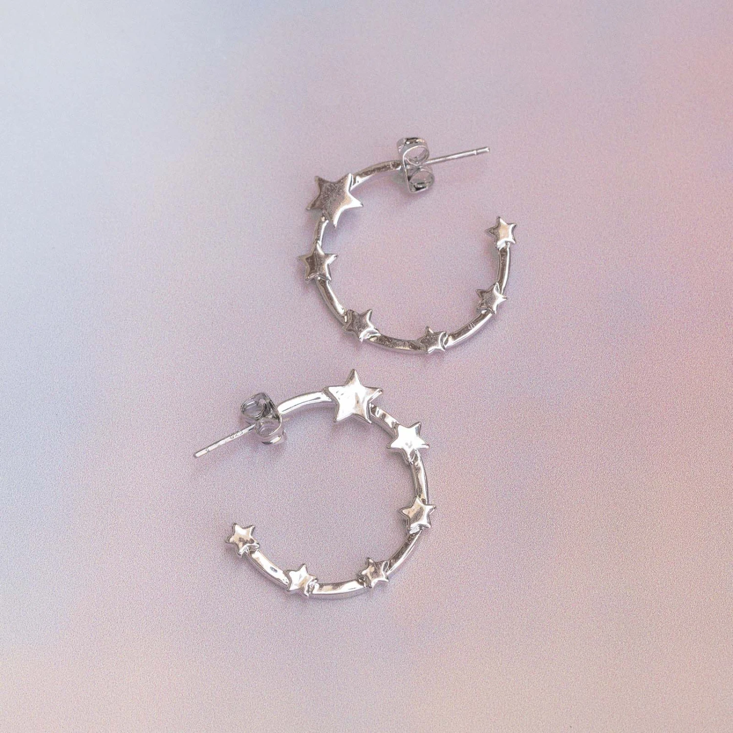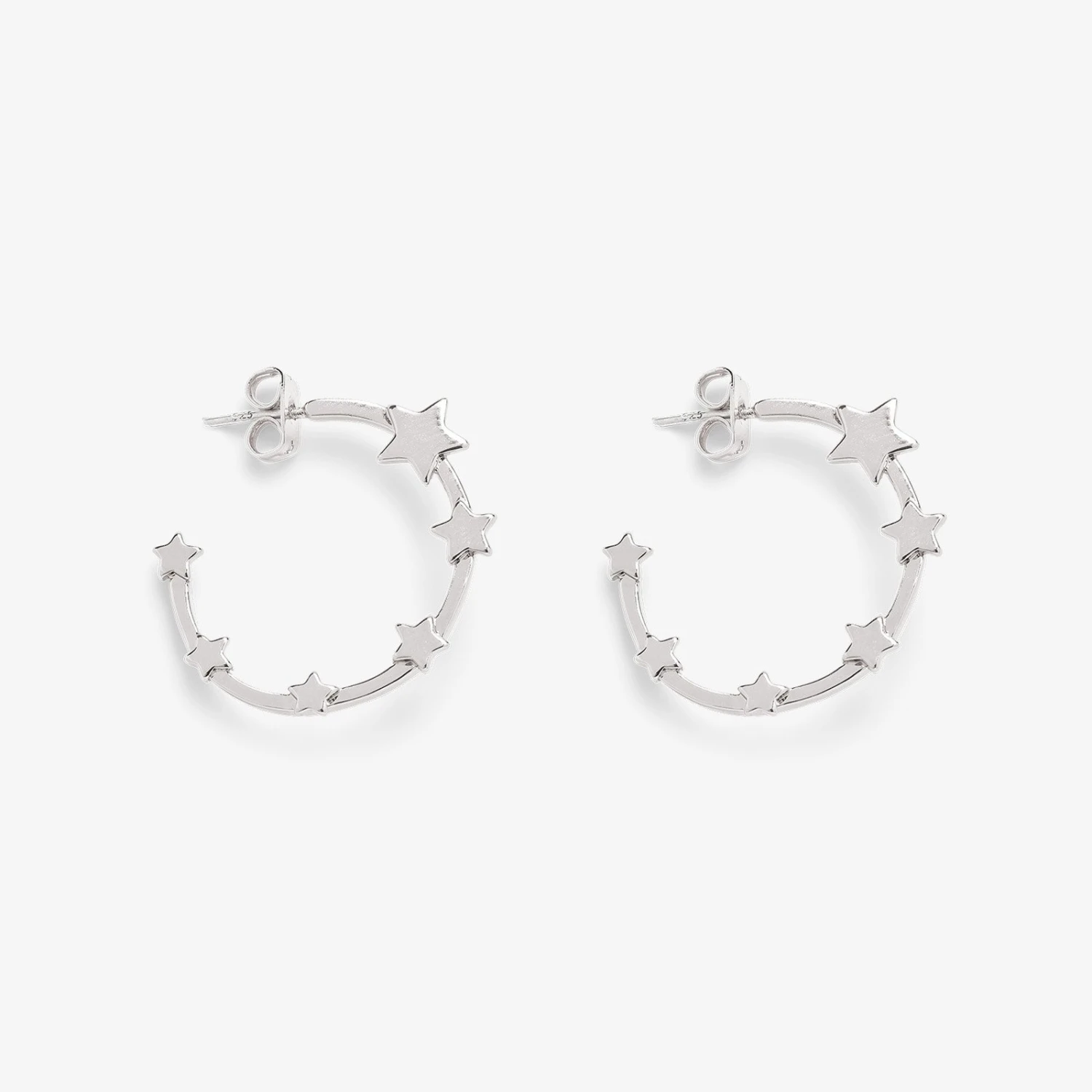 Shoot for the stars in our Starlight Hoop Earrings. This sleek silver pair is accented with a constellation of star charms for a little Milky Way magic. Hint: Wear it with our Celestial Malibu Bracelet for a totally lunar look.