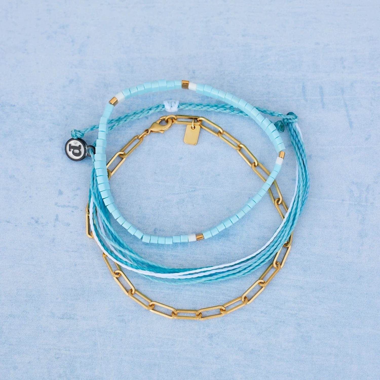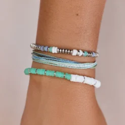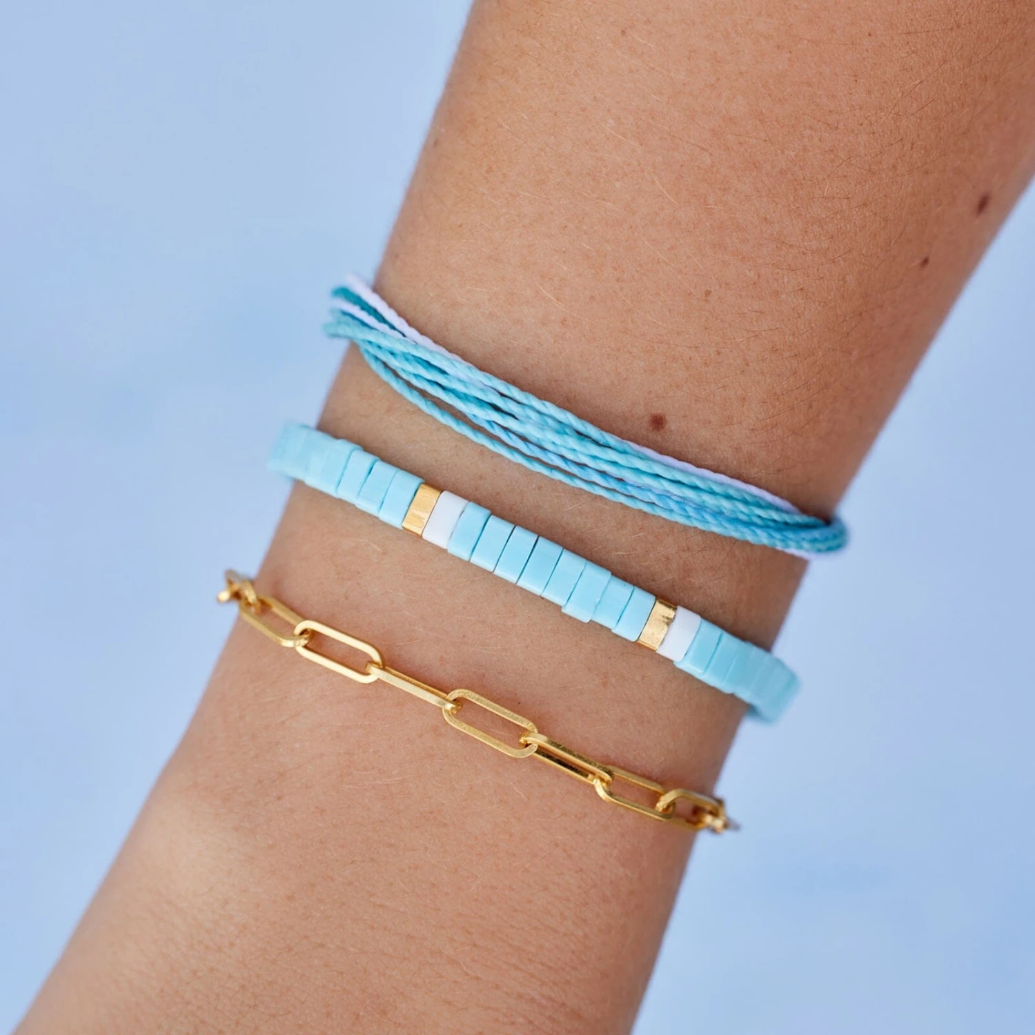 Mediteranian-inspired stack of gold-plated links and pastel tile beads including string, stretch, and and structured details.