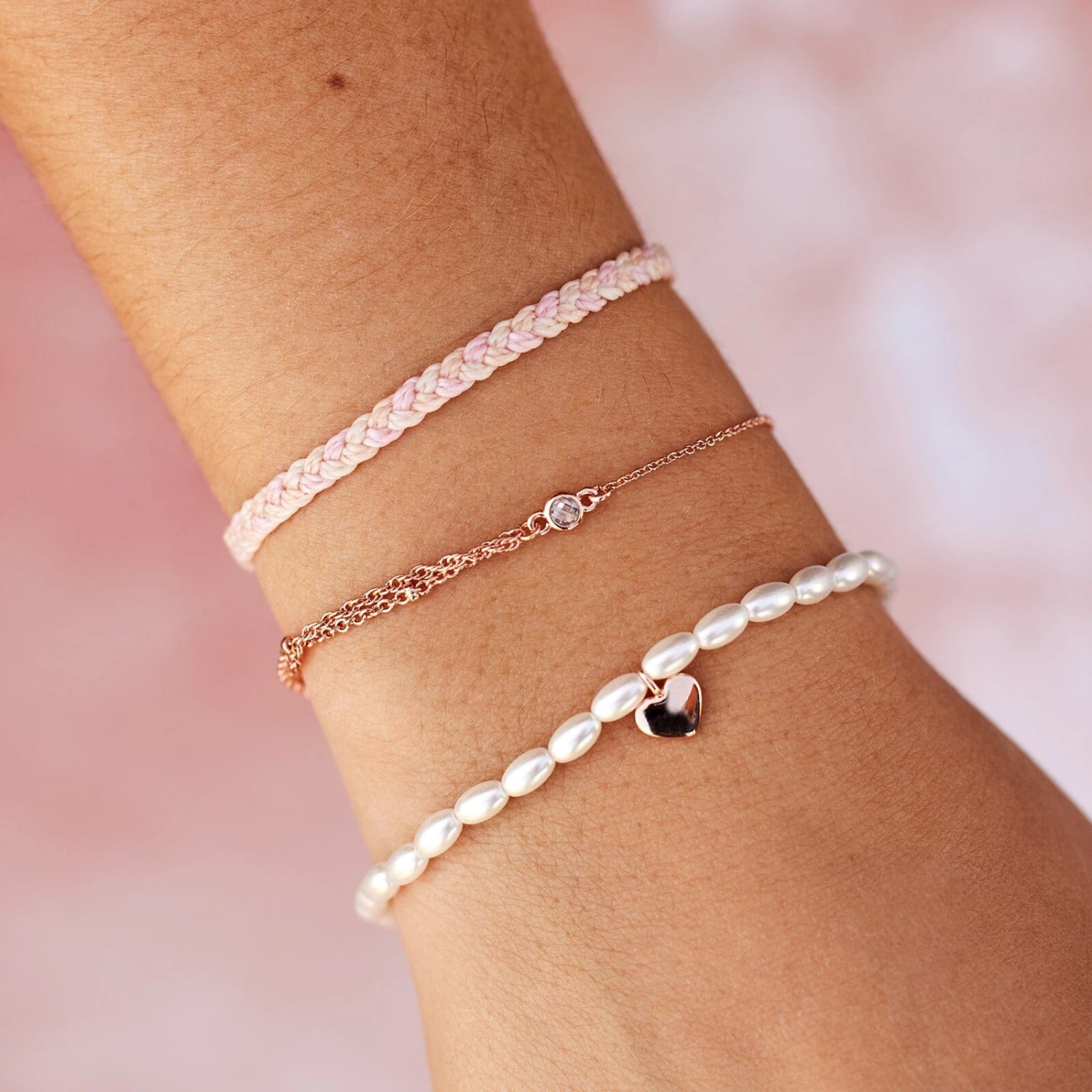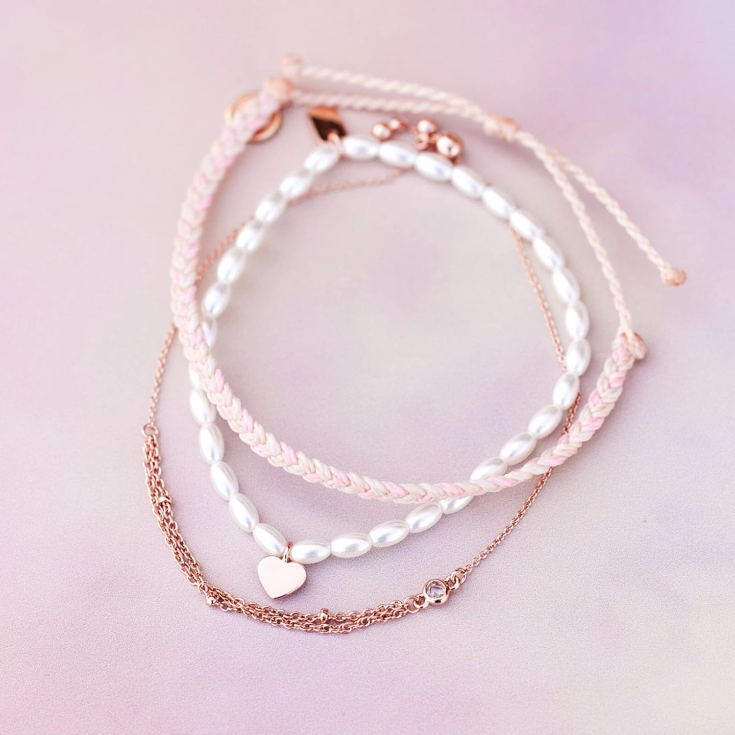 Delicate details fit for a true romantic. This mix of stones and beading incorporates soft tones like blush, baby pink, and vanilla for a whimsical stack to add to your collection.