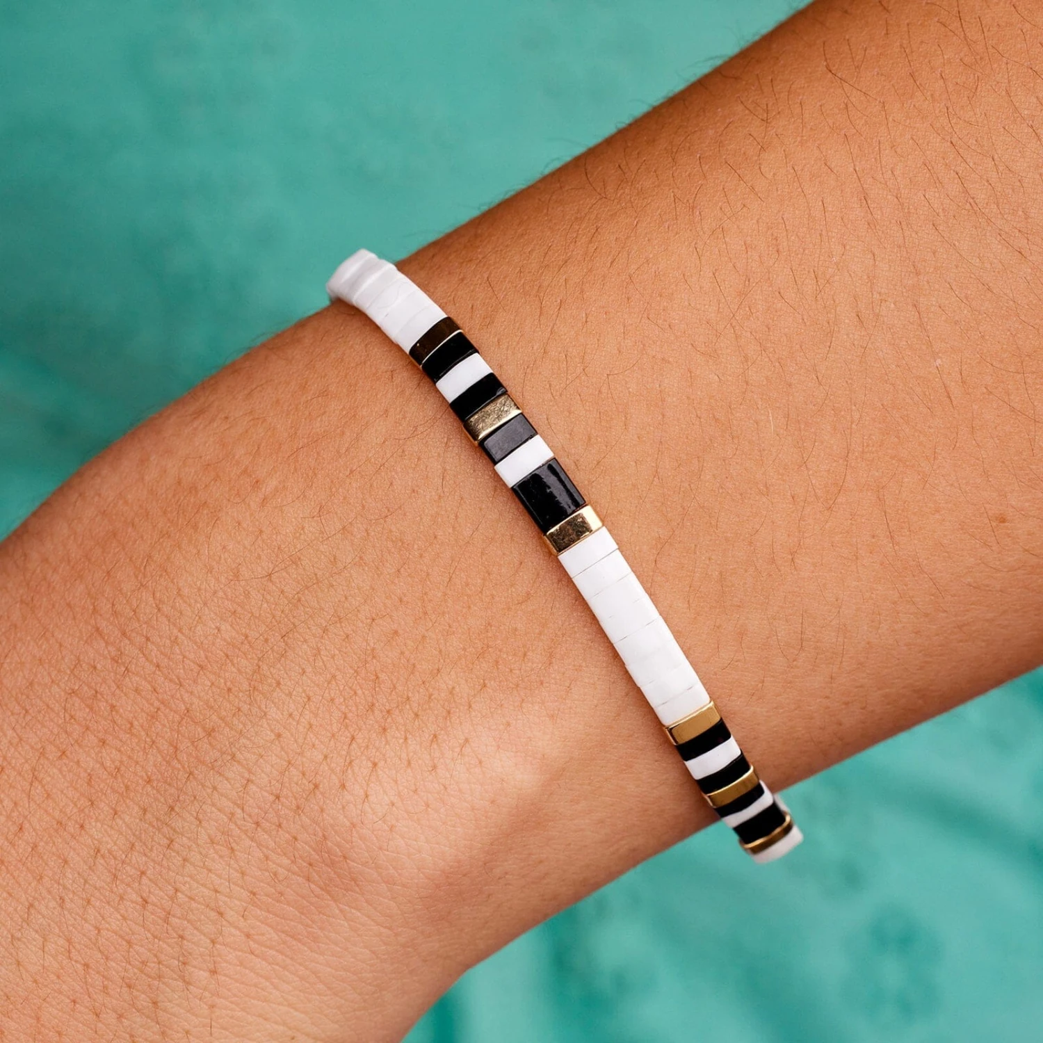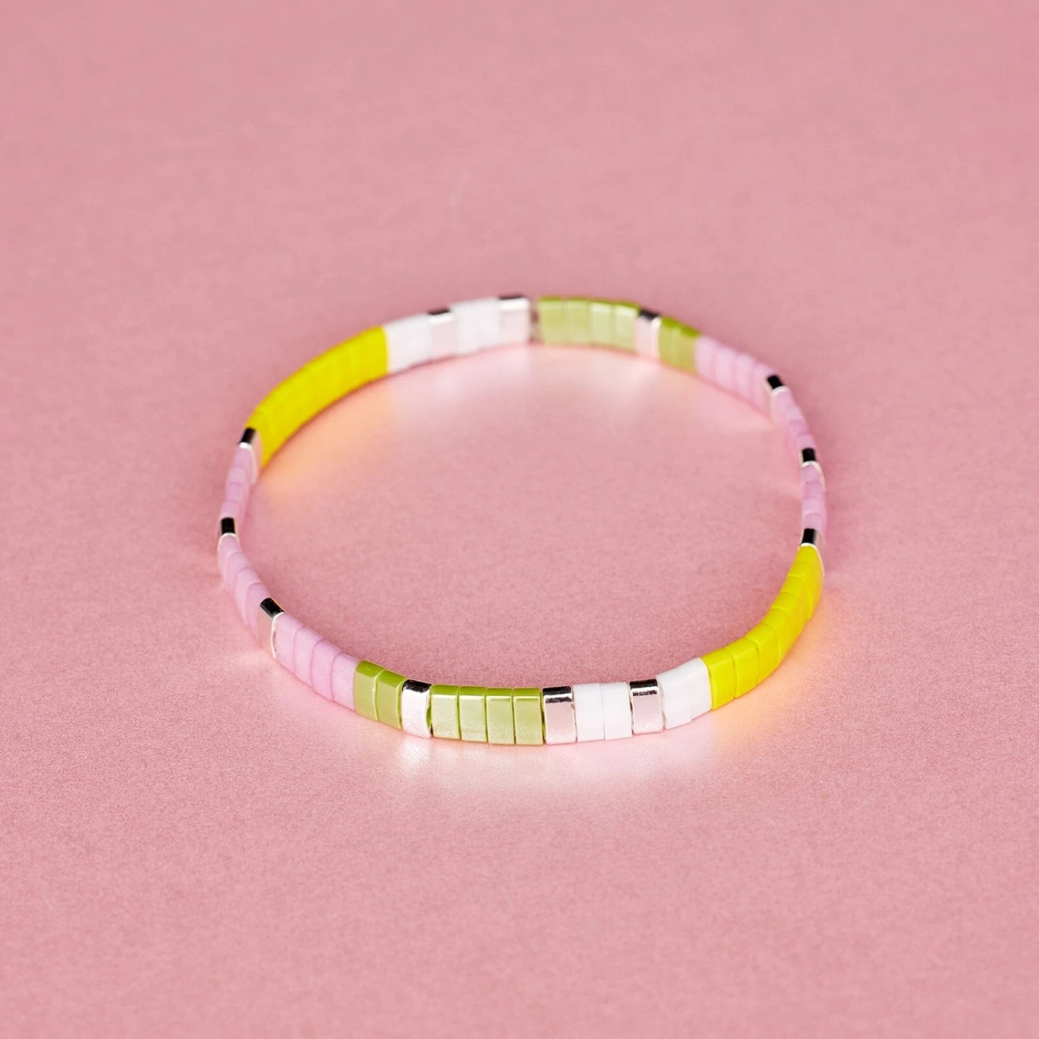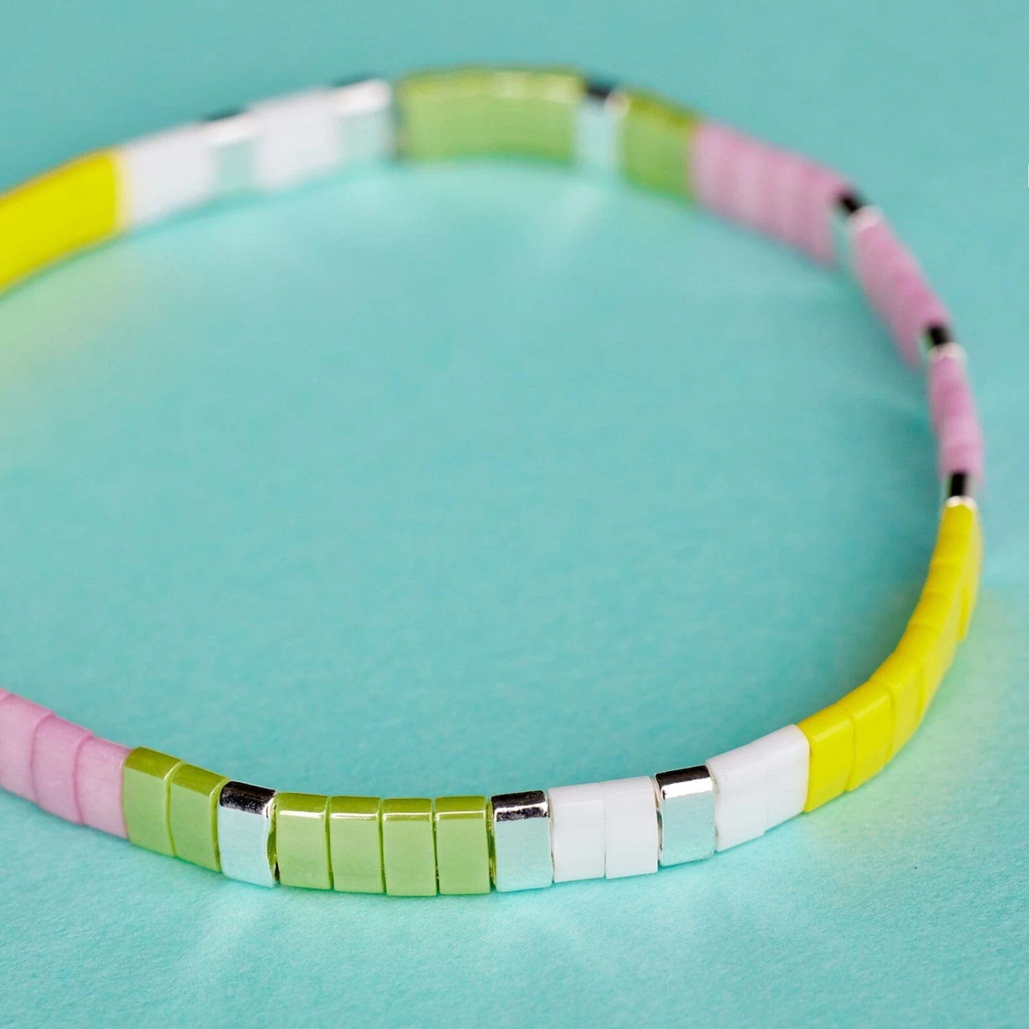 Our style motto? The bolder the better—as proven by the Tile Bead Stretch Bracelet. This chunky, slip-on style comes in two eye-catching color combos: A bright beauty with shades of yellow, pink and green; or a striking mix of black, white and gold.